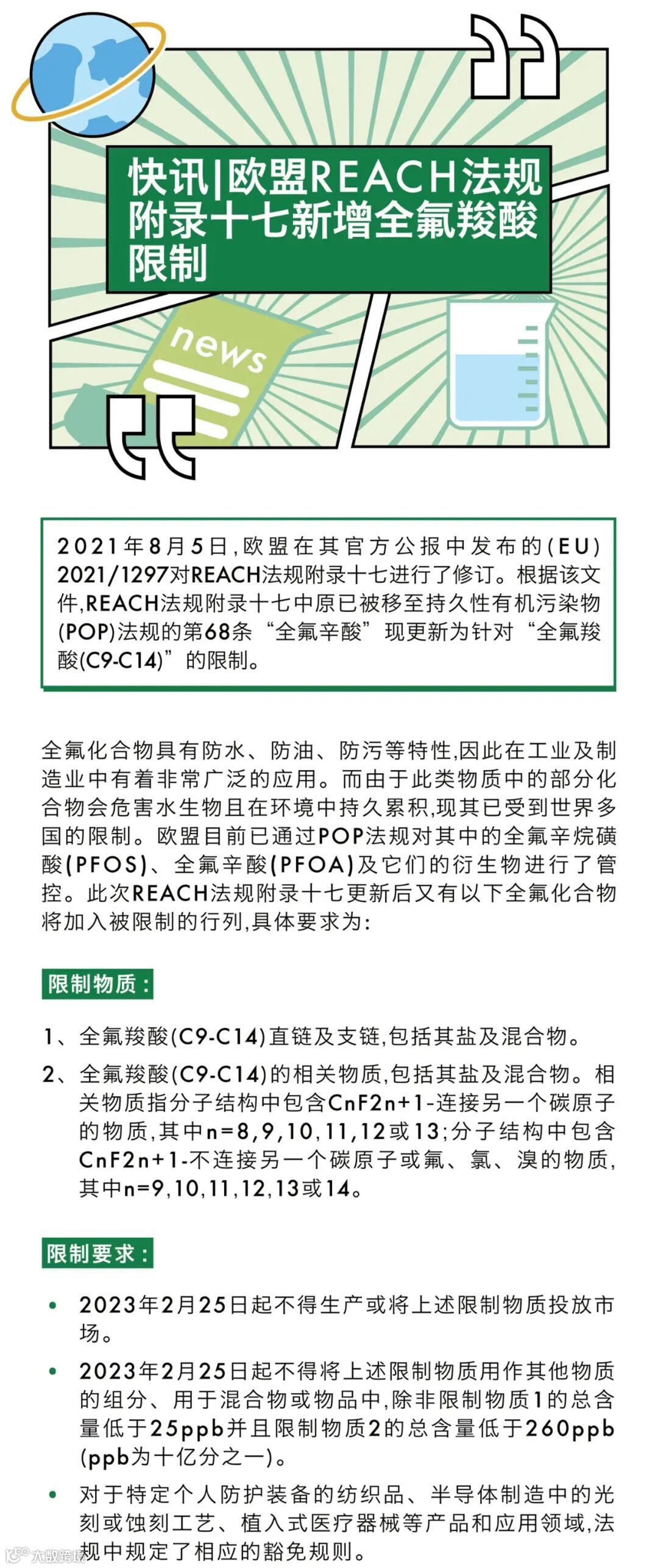 当前,全氟化合物是各国化学安全法规关注的热点。美国已有多个州通过限制或要求通报等手段对它们采取了管控。德国、丹麦等欧洲国家也已限制了食品接触材料中相关物质的检出。此类物质多用于纺织品及皮革的表面处理、纸张的防油处理、食品接触材料的不粘涂层等。