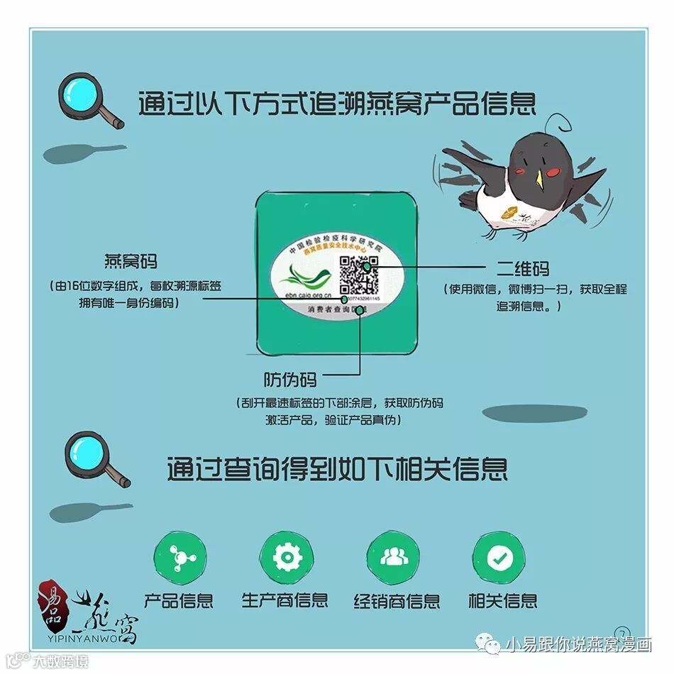 第五步:包装完贴溯源标签,而溯源标签扫码进去的信息有燕屋、每盏燕窝的生产日期、重量、进口公司、进口商......)一目了然。
