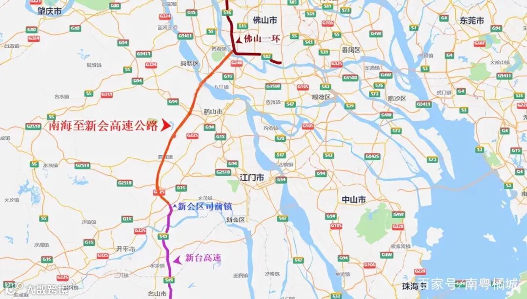 本项目起点位于广东省佛山市南海区境内南九路与广州绕城高速西樵段( G1508 )交叉处,路线向南布设,跨越西江后进入江门市境,大部分路线穿过江门所属鹤山市境,途经佛山南海区九江镇、江门鹤山市古劳镇、龙口镇、鹤城镇、址山镇,终点位于江门市新会区司前镇,与新台高速顺接,总体呈东北—西南走向。路线全长54公里,总投资165亿元。