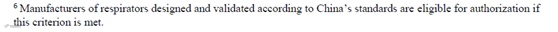 该条加注:如果符合这个原则,按照中国标准设计和验证的口罩的制造商是可以获得EUA授权的。