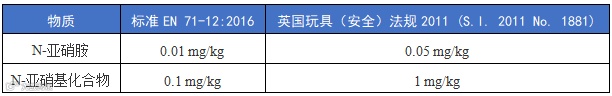 *注:标准EN 71-12:2016中第4.2条表2第a点中的限值(即针对意图供36个月以下儿童使用,且意图或可能放入口中的弹性体玩具的限值)低于英国玩具(安全)法规2011 (S.I. 2011 No. 1881)附表2第3部分第8点中规定的符合的限值。这些限值具体如下: