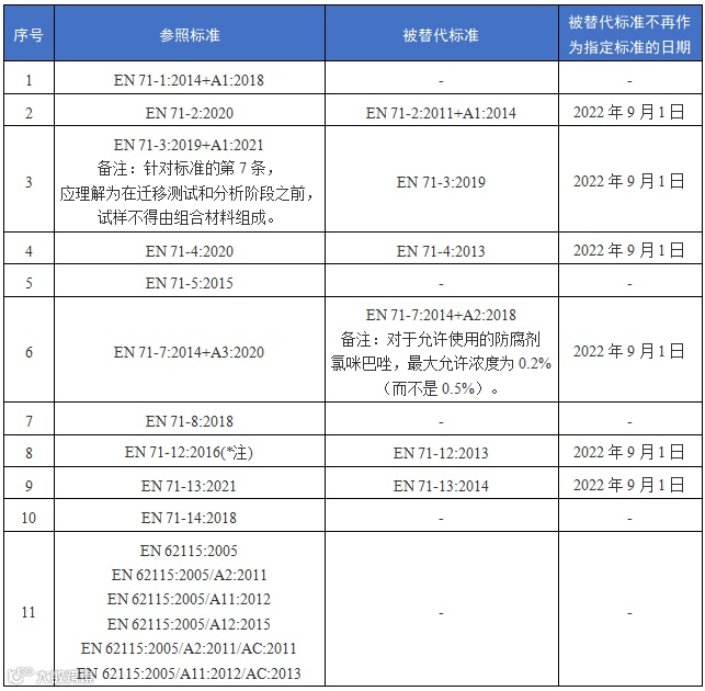 提议的英国玩具(安全)法规2011 (S.I. 2011 No. 1881)参照的指定标准完整列表(自2022年9月1日起)如下表: