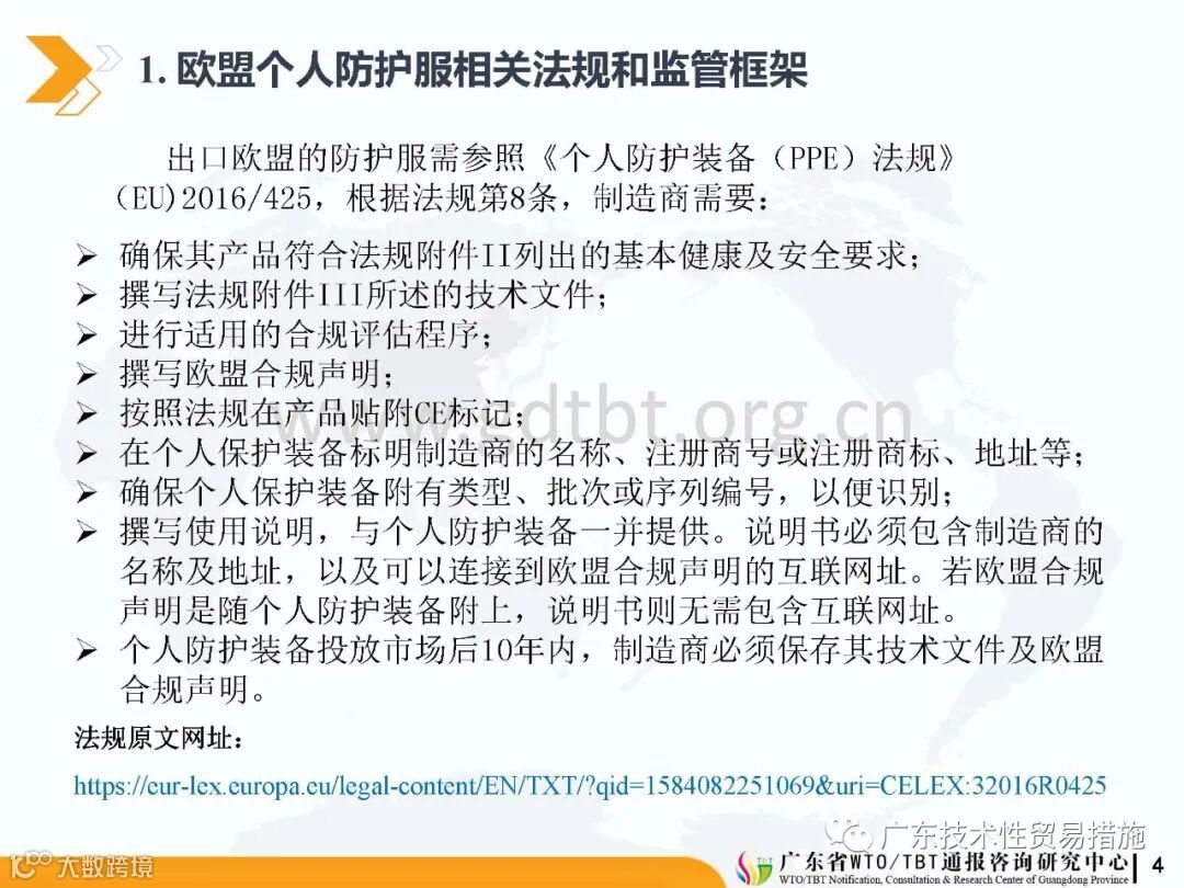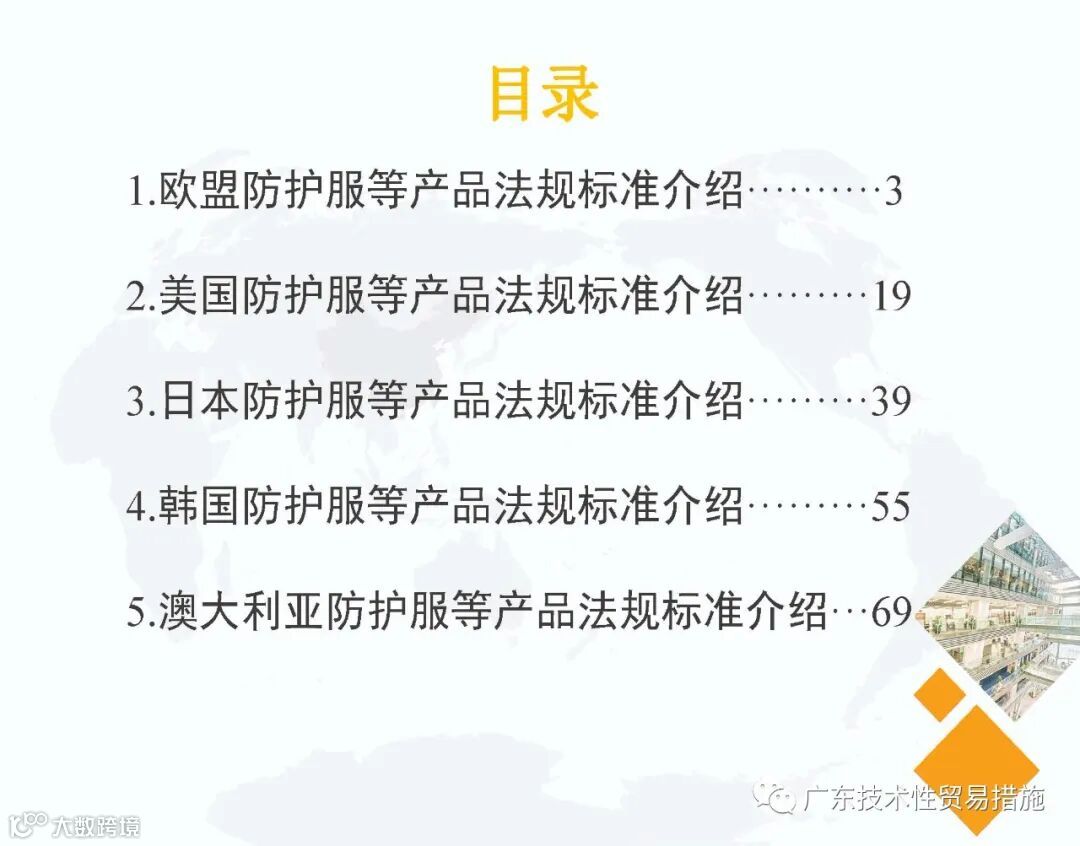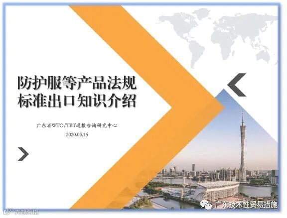 为帮助企业了解国外防护服、口罩等产品准入要求,我中心收集整理了相关资料,并形成《防护服等产品法规标准出口知识介绍》(第一版),供企业参考。由于时间仓促,对选编内容难免有不当之处,如有不当,敬请尽快与我们联系更正!