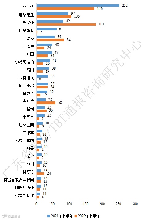 在与我国签订共建“一带一路”合作文件的138个国家/地区中*,2021年上半年共有48个国家/地区提交了1150件TBT通报,同比增加14.9%,占WTO成员总通报数的56.1%。其中,乌干达是2021年上半年提交的TBT通报最多的“一带一路”国家;巴基斯坦今年上半年提交了61件TBT通报,与去年同期相比大幅提升,且全部在本年第一季度(1月1日-3月31日)提交;科特迪瓦于上半年共提交了35件TBT通报,而去年同期并没有提交任何通报(详见图1)。
