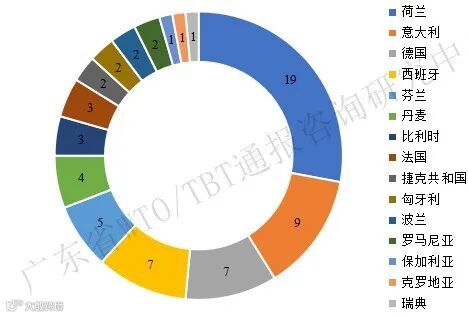 在通报国家方面,通报中国产农食产品最多的是荷兰,共通报19例,占中国产农食产品被通报总数的27.9%,其次为意大利、德国和西班牙(详见表7、图8)。