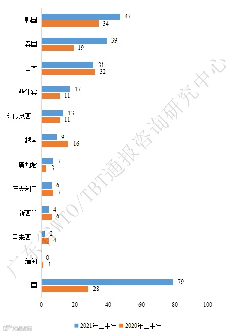 《区域全面经济伙伴关系协定》(RCEP)*成员国上半年共提交了254件TBT通报,同比上升47.7%。其中韩国提交的TBT通报数最多(47项),占RCEP成员国提交总量的18.5%;泰国、日本上半年在制定技术性贸易措施上也比较活跃,提交的TBT通报数分别为39件和31件;其他成员国如越南、新加坡、澳大利亚、新西兰、马来西亚等上半年提交的通报较少,均不到10件;文莱、柬埔寨、老挝、缅甸本年度上半年并未提交TBT通报(详见图2)。
