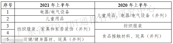 (2021年上半年数据来源于欧盟RASFF官网,收集于2021年7月8日;2020年上半年数据来源于《2020年上半年TBT通报和欧美召回情况》)