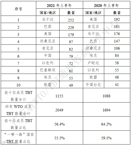 2021年上半年(1月1日至6月30日,下同),WTO的164个成员中共有77个WTO成员提交了2049件TBT通报*,其中包括1268件技术法规和合格评定程序的新通报、752件补遗和勘误通报、29件修订通报。提交通报数量位列前10位的成员依次是:乌干达、巴西、美国、坦桑尼亚、肯尼亚、中国、以色列、巴基斯坦、埃及、欧盟(详见表1)。