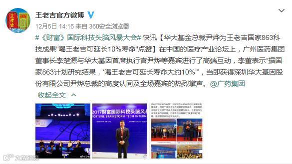 随后王老吉官方微博也迅速分享了这个消息,并表示这一说法还得到了深圳华大基因股份有限公司尹烨总裁的高度认同以及全场嘉宾的热烈掌声。