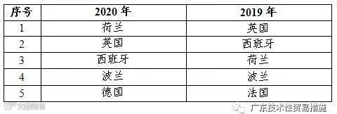在通报国家方面,通报中国产农食产品最多的是荷兰,共通报22例,占中国产农食产品被通报总数的17.1%。其次为英国和西班牙。排名前四位的通报国家与2019年的情况基本一致(详见表7、图7)。