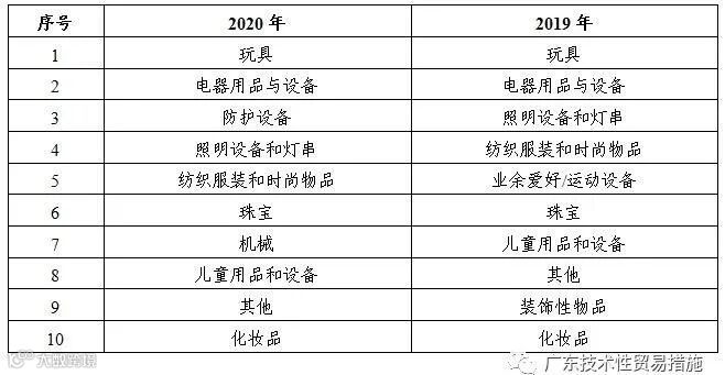 (2020年数据来源于欧盟RASFF官网,收集于2021年1月11日;2019年数据来源于本网《2019年TBT通报和欧美召回情况》)