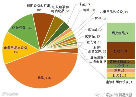 其中,原产地为中国的召回通报有1108例,比2019年减少2.4%,占安全门通报总数的49.8%,比重较上年下降2.8个百分点。被通报最多的产品为玩具(43.0%),几乎占中国产品通报数的一半,其次为电器用品与设备(14.2%)、防护设备(13.4%)、照明设备和灯串(9.6%)(详见表3、图3)。