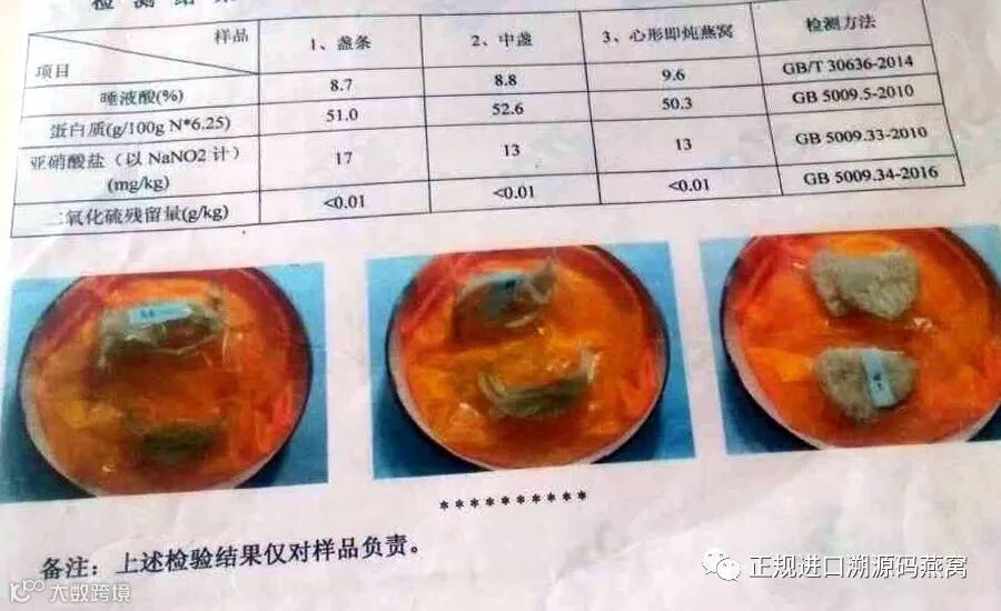 并且,刚才检测的是干燕窝亚硝酸盐的含量,吃燕窝之前,这些亚硝酸盐还被稀释了N遍:首先泡发4个小时,然后滤毛清洗,挑毛清洗,撕完燕窝再清洗......如此这般,亚硝酸盐还有多少,你还要算吗?说实话,像腊鱼,腊肉,腊肠,尤其是腌制一周左右的菜,亚硝酸盐含量最高,这些食品更要关心。另外,国内学者指出,在国家食品条列允许存在亚硝酸盐的食品中并没有燕窝。并且我国进口食品的要求是相当严格的,所以你完全可以放心食用了!