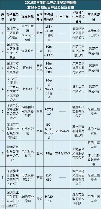 本次督抽查发现,3批次样品游离甲醛项目不合格,包括(标称)东莞市吉丽文具有限公司生产的1批次吉丽液体胶水、(标称)广东晨奇文具实业有限公司生产的1批次晨奇文具固体胶、(标称)得力集团有限公司生产的1批次得力固体胶。
