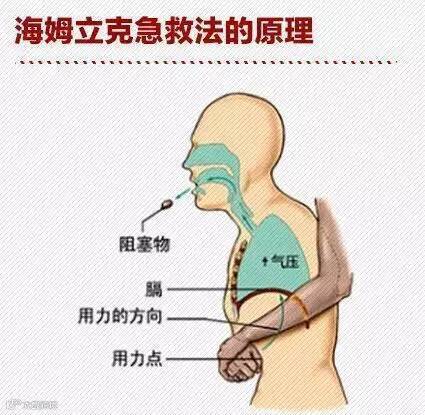 其具体原理:利用冲击腹部--膈肌下软组织,被突然的冲击,产生向上的压力,压迫两肺下部,从而驱使肺部残留空气形成一股气流。这股带有冲击性、方向性的长驱直入于气管的气流,就能将堵住气管、喉部的食物硬块等异物驱除,使人获救。