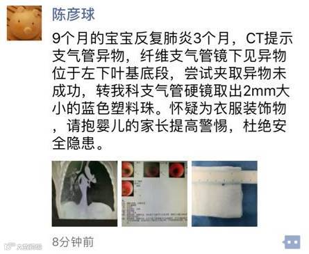 医生怀疑为衣服装饰物,因此提醒请抱婴儿的家长提高警惕,杜绝安全隐患。