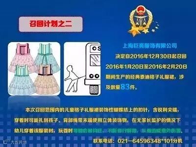 本次召回范围内的儿童格子礼服裙装饰性蝴蝶结上的扣针,含锐利尖端,穿着时可能扎到孩子。背部绳带末端使用立体装饰物,在无家长监护的情况下幼儿穿着该服装时,玩耍时可能会被钩住,不能自行解除,从而造成意外伤害。