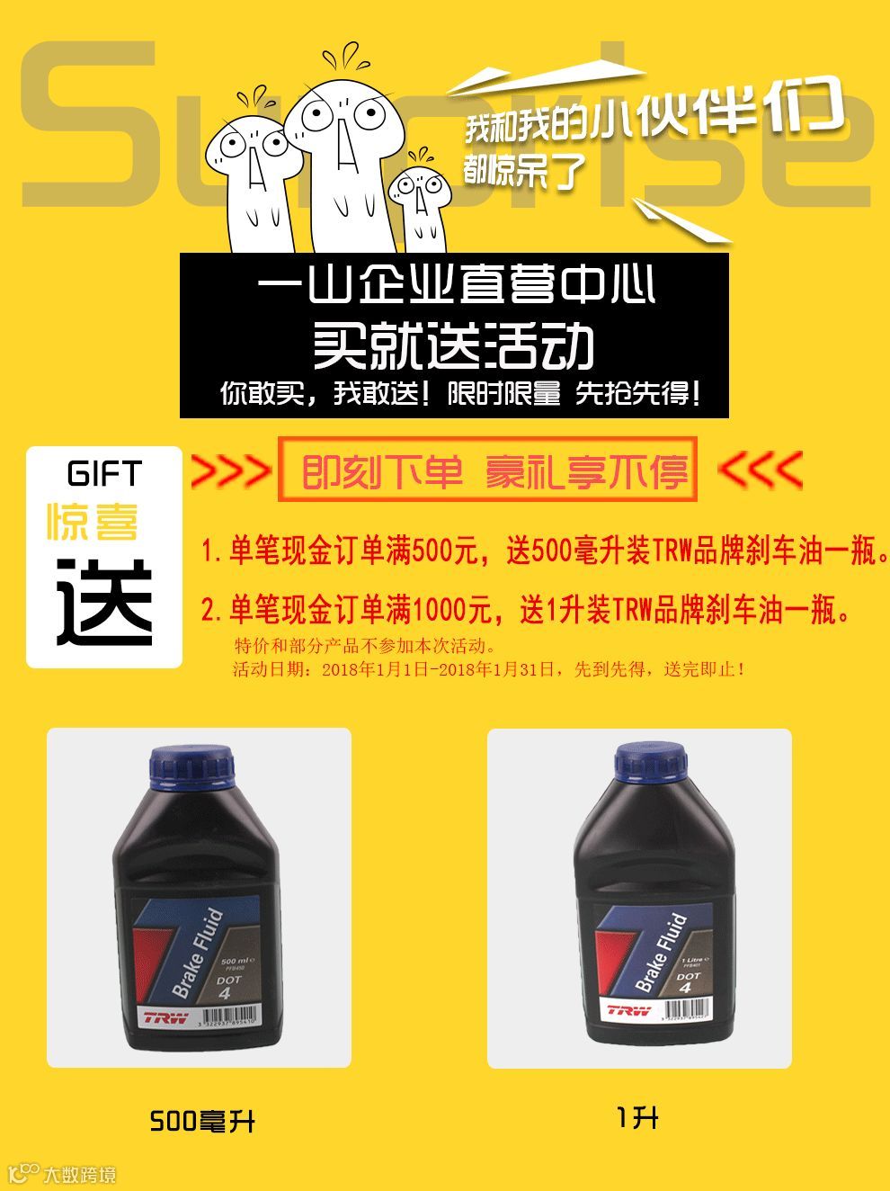 1.单笔现金订单满500元,送500毫升装TRW品牌刹车油一瓶。