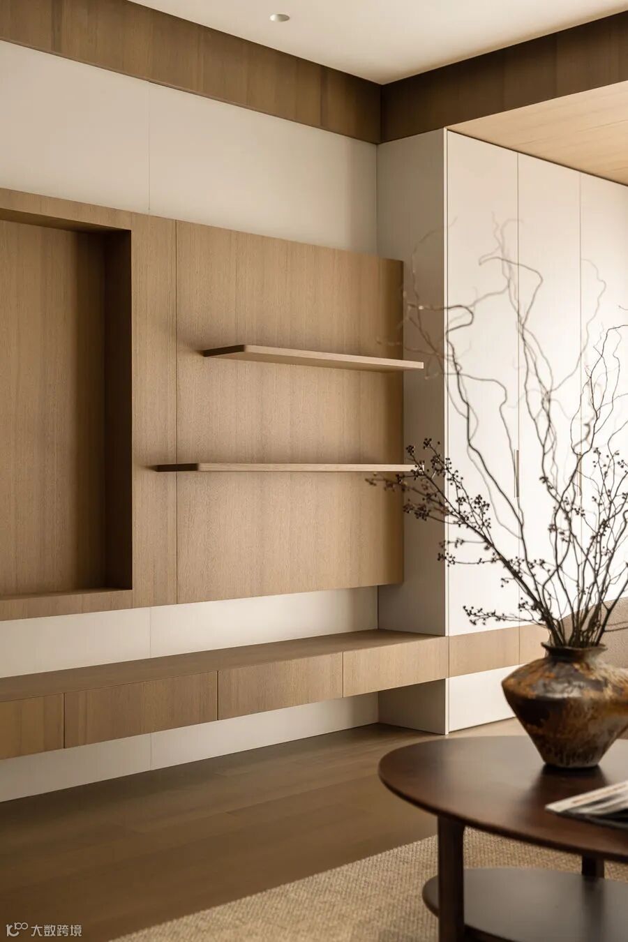 以细腻的白、原木纹理铺展空间。