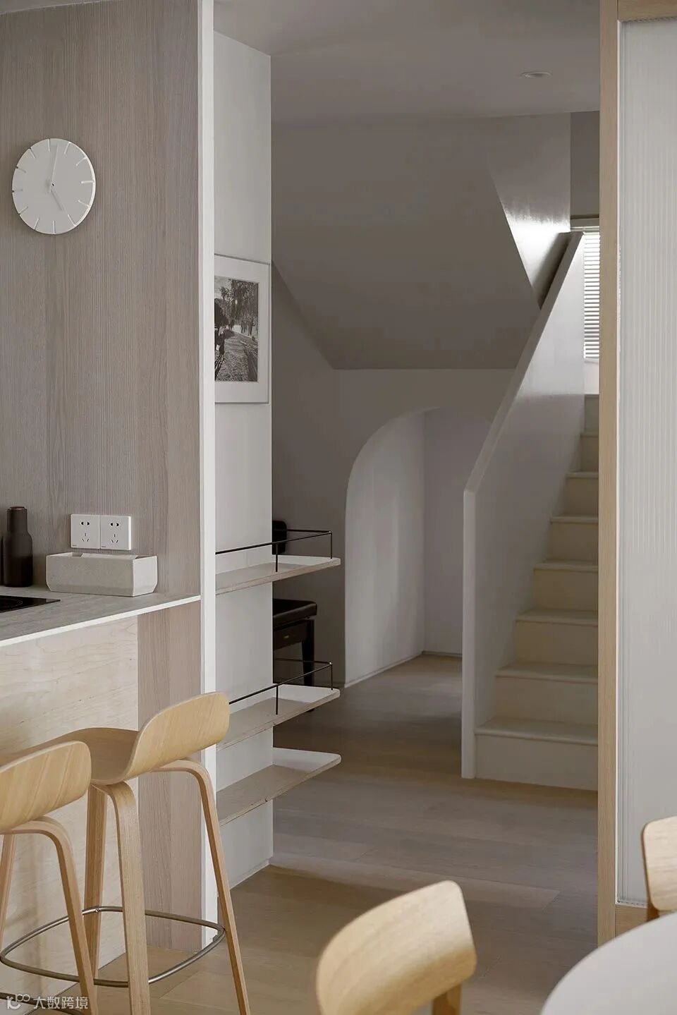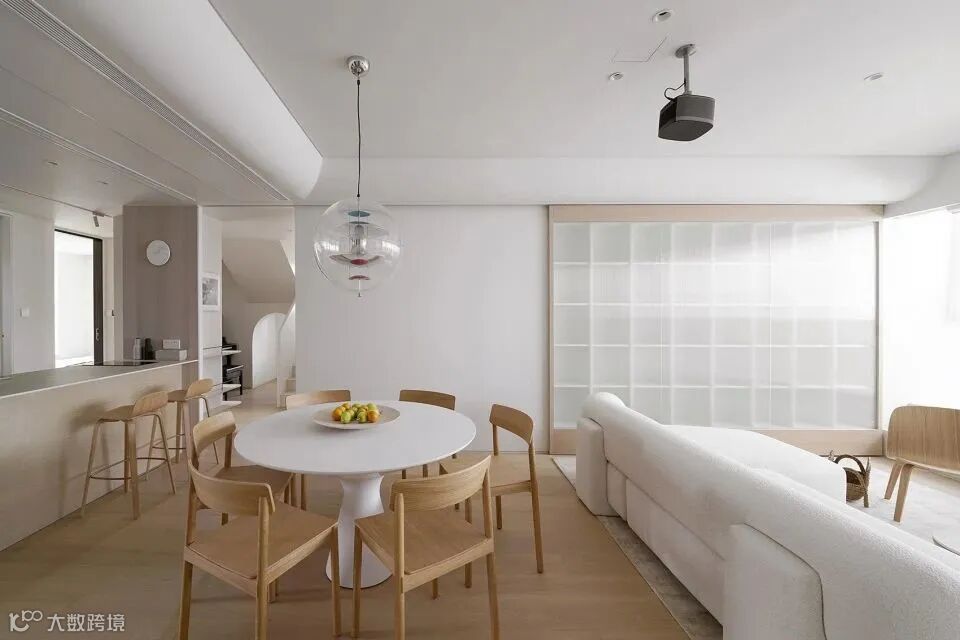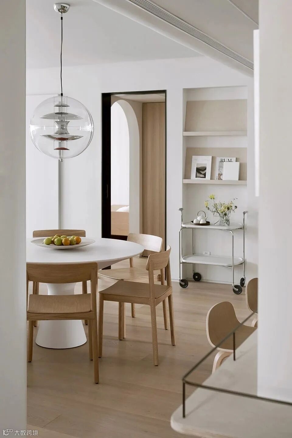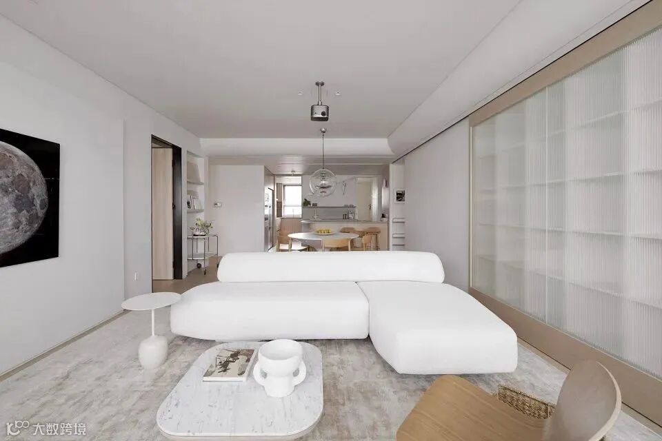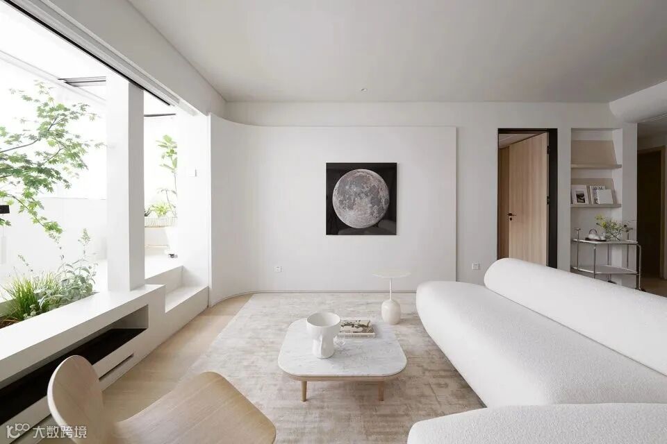 The living room is curved wall, so that the living room overall space more soft.Fireplaces and corrugated glass display cases make this home the softest place.