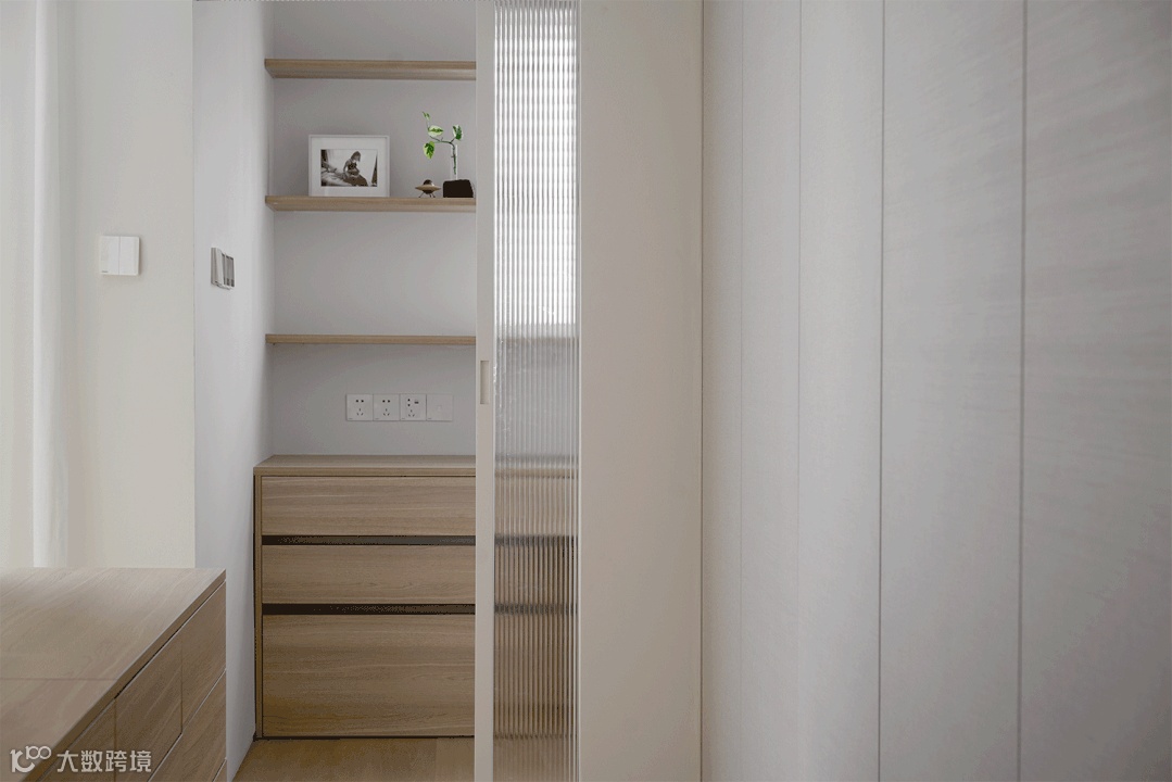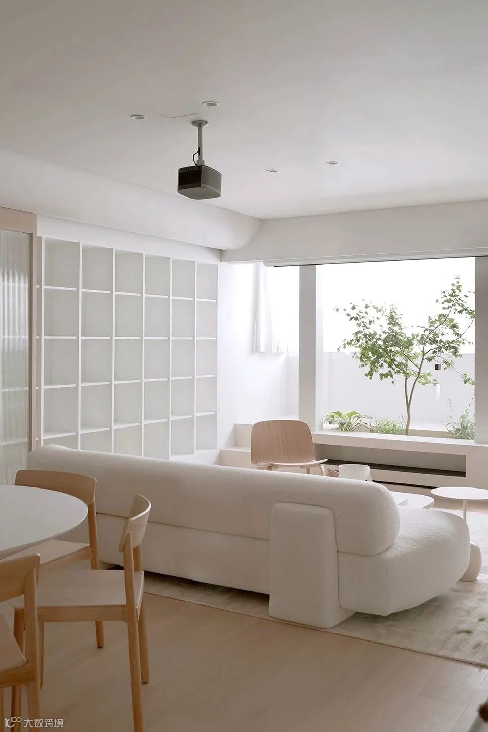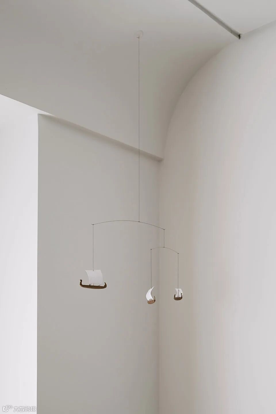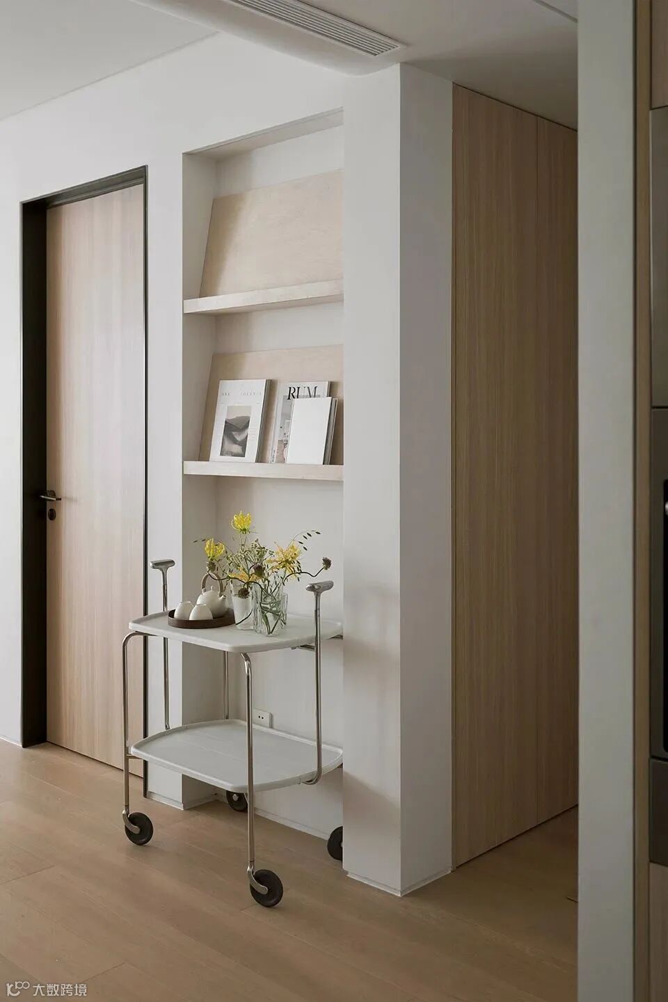 The living room is curved wall, so that the living room overall space more soft.Fireplaces and corrugated glass display cases make this home the softest place.