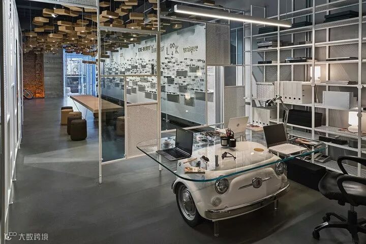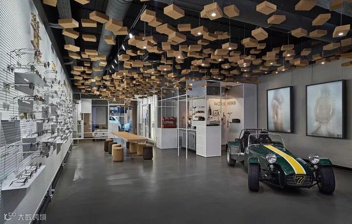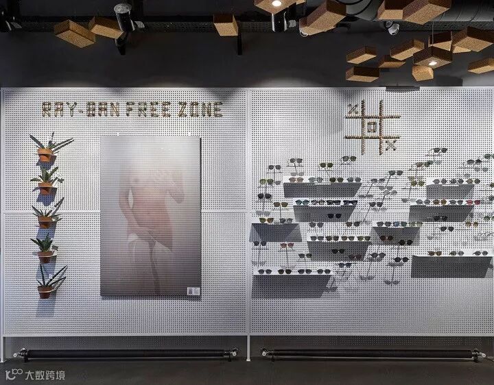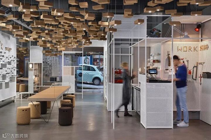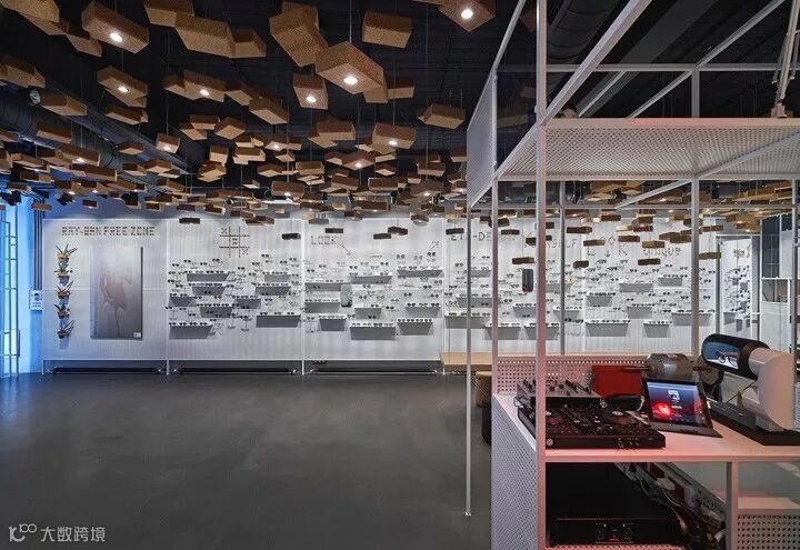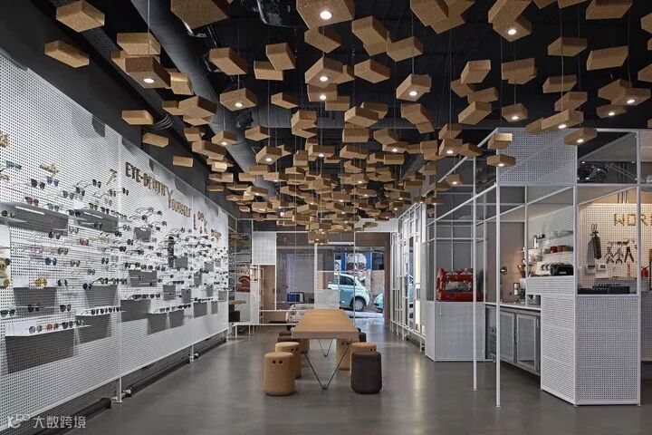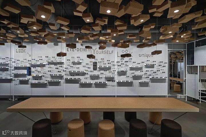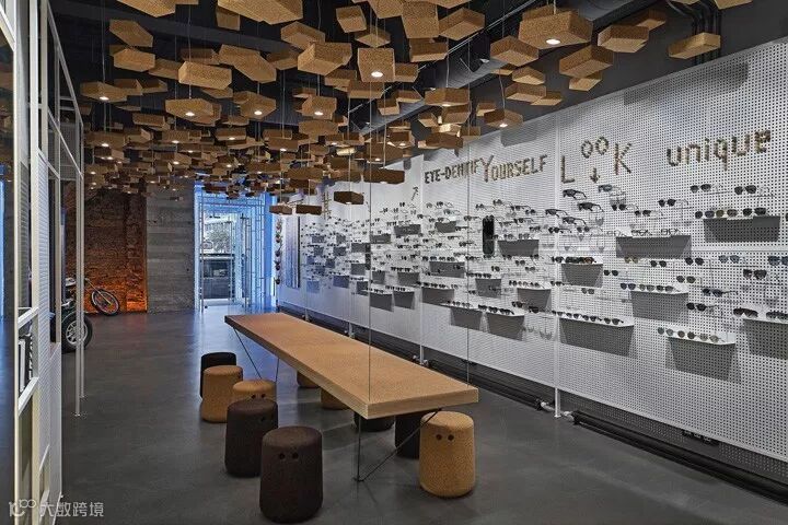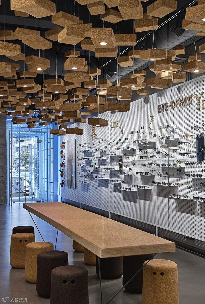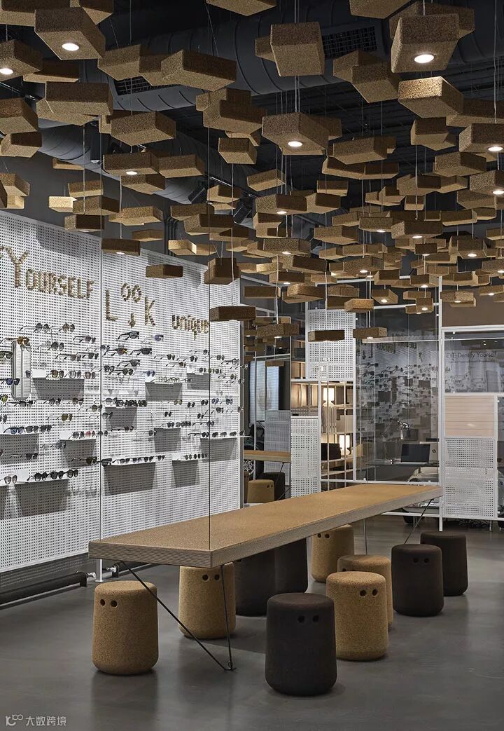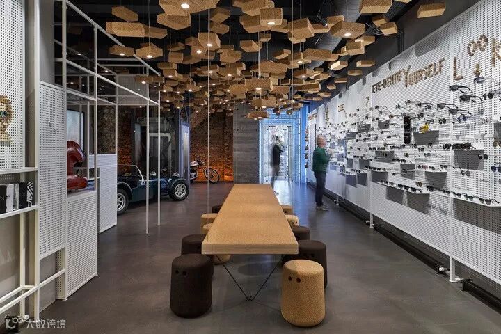 比如以钢架和钢板的组合,构筑了一个多用途的展示背景墙,即可以展示眼镜也可以展示艺术作品。运用550块软木瑜伽砖作为空间灯具装置设计,其中95块装有光源。还有两张悬挂的4米长的软木长桌,各自配以Bob软木座凳。从细节和构想去重新诠释一个普通的材质,并通过精湛的技艺将其实现。