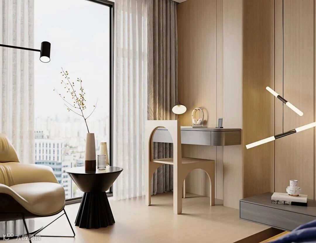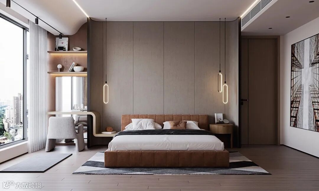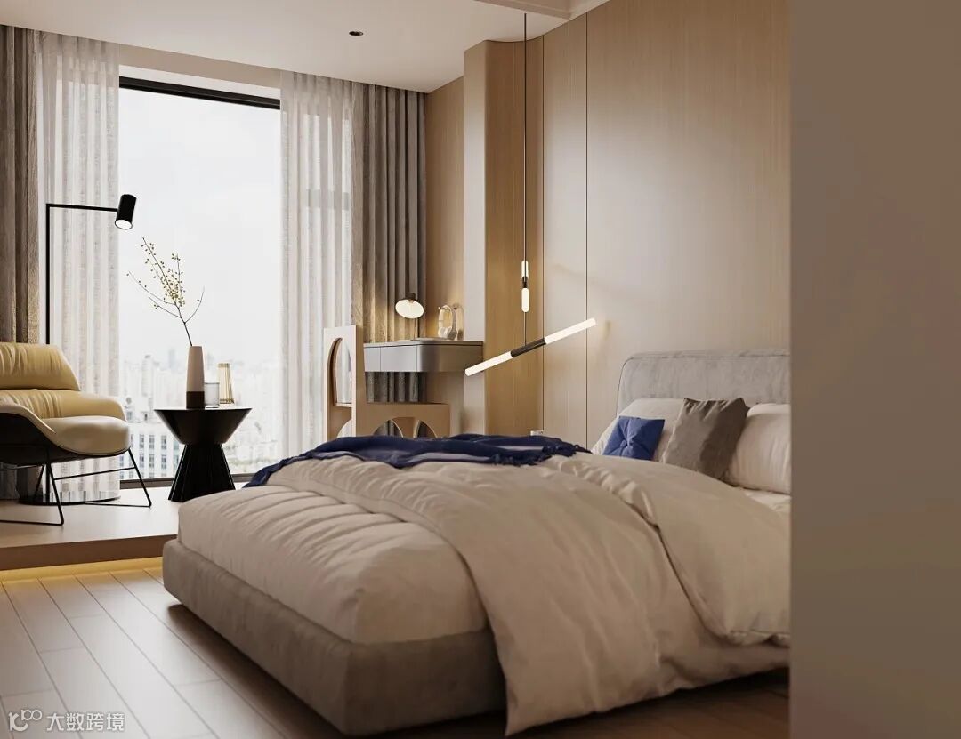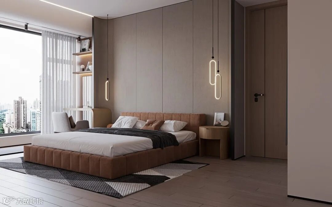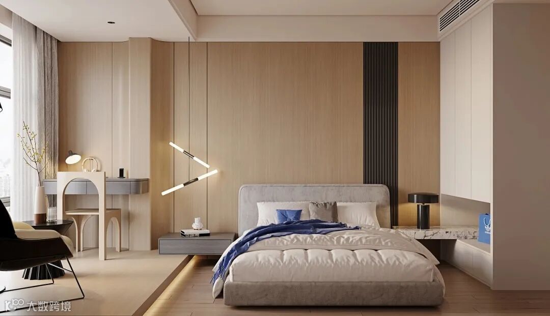 床头墙与沙发墙一样作为靠放大件家具的墙面,换成木质感的显得更加厚实,而且自然舒适的木质,也能让空间显得更加自然精致,提升卧室空间的温馨情趣。