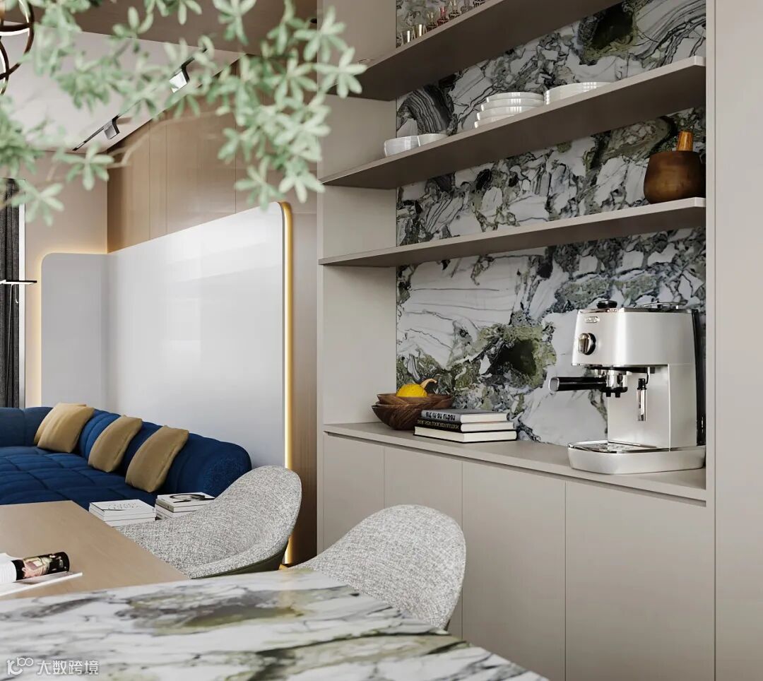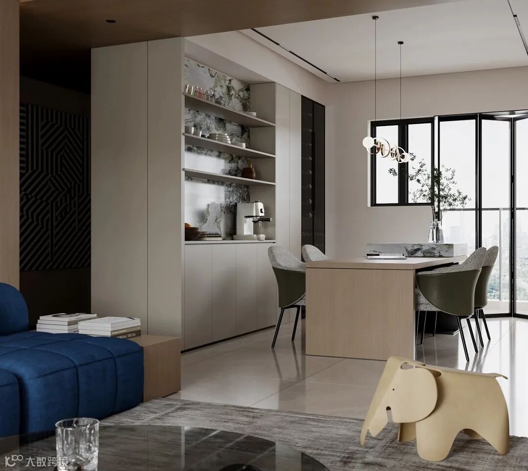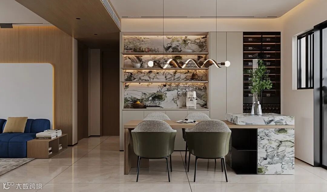 餐区的设计简约又不失高级,用岩板打造的岛台,成为一件永恒的自然艺术品。搭配上天然木饰面,给人一种宁静、祥和的感觉。