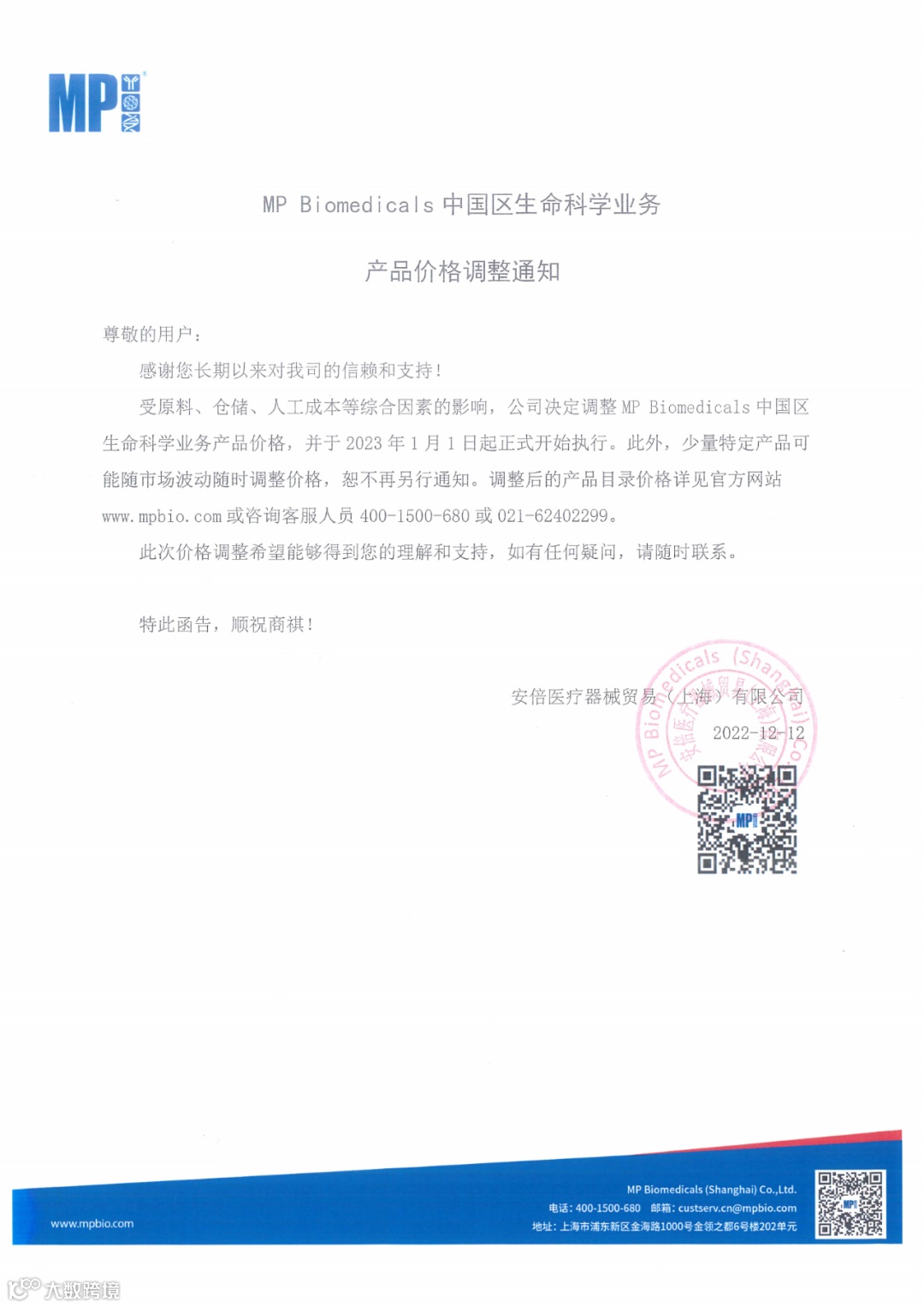 本次调价于2023年1月1日开始执行,建议客户及早备货,节省经费!