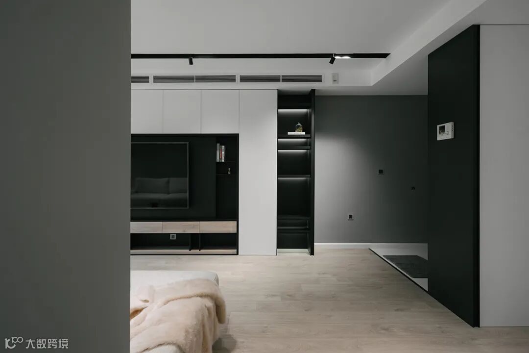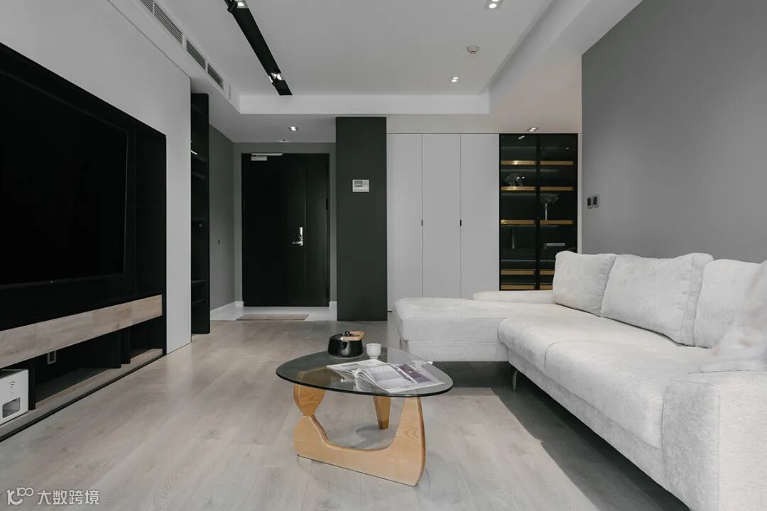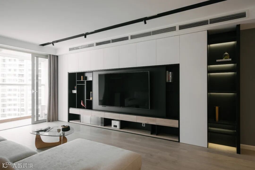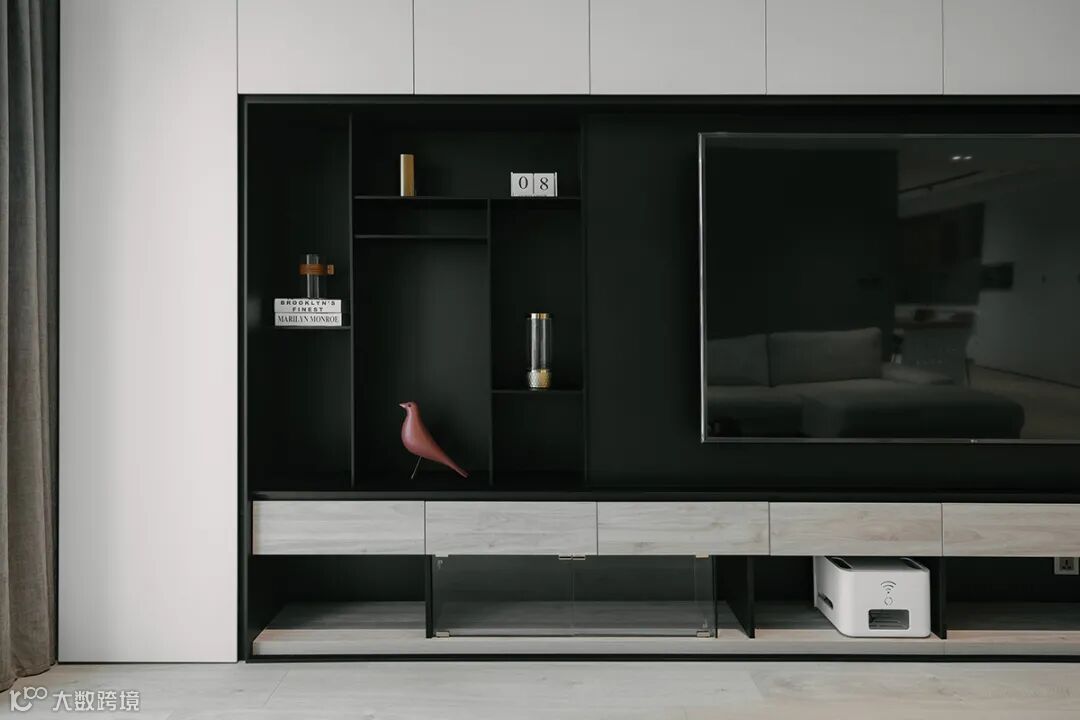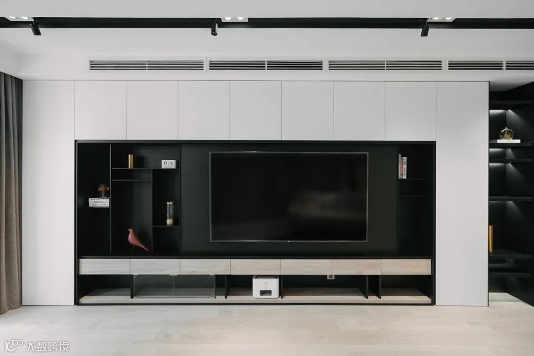 打造收纳型电视墙,原木色与黑白搭配,冷暖两色相互中和,质感丰富。除了电视区域,其他区域均可收纳,满墙的收纳空间。