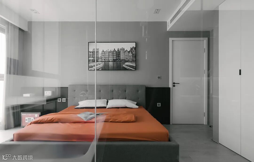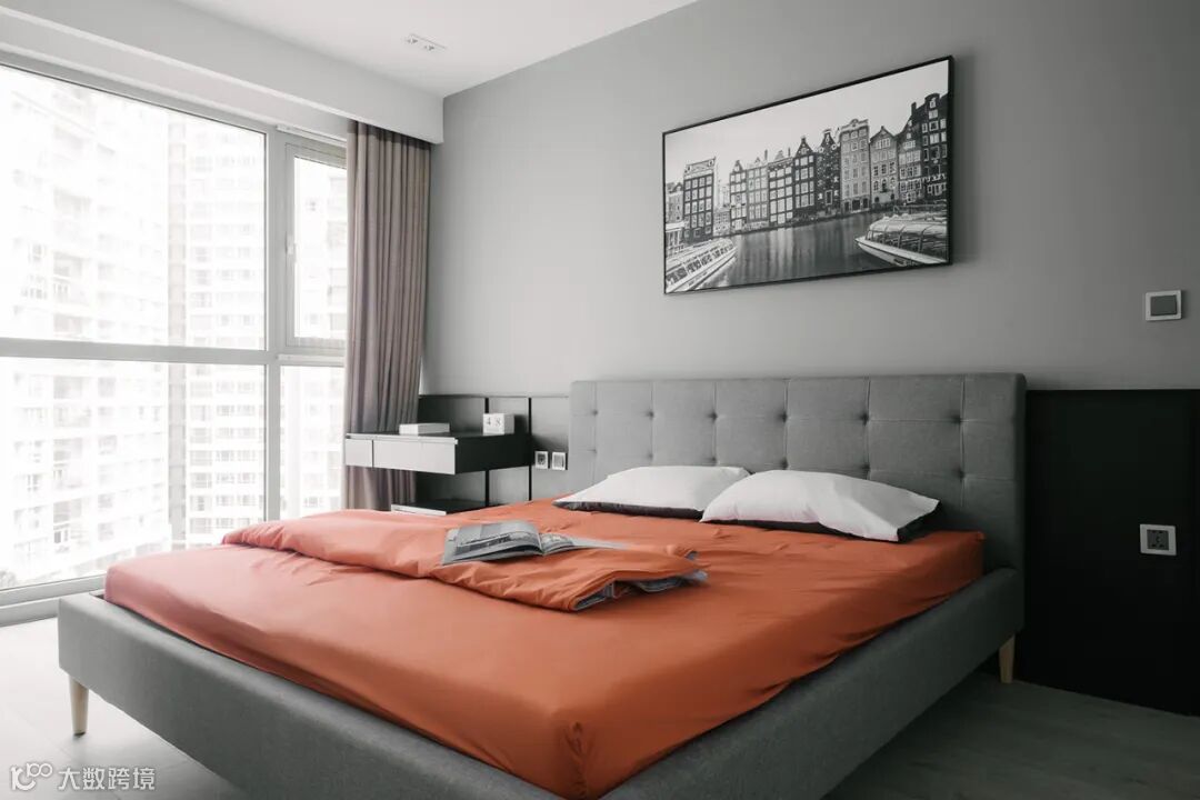 主卧以黑白灰色为主,灰色墙体顶面搭配黑色皮质大床,床品一抹橙色引人瞩目,充满个性,气质冷静。