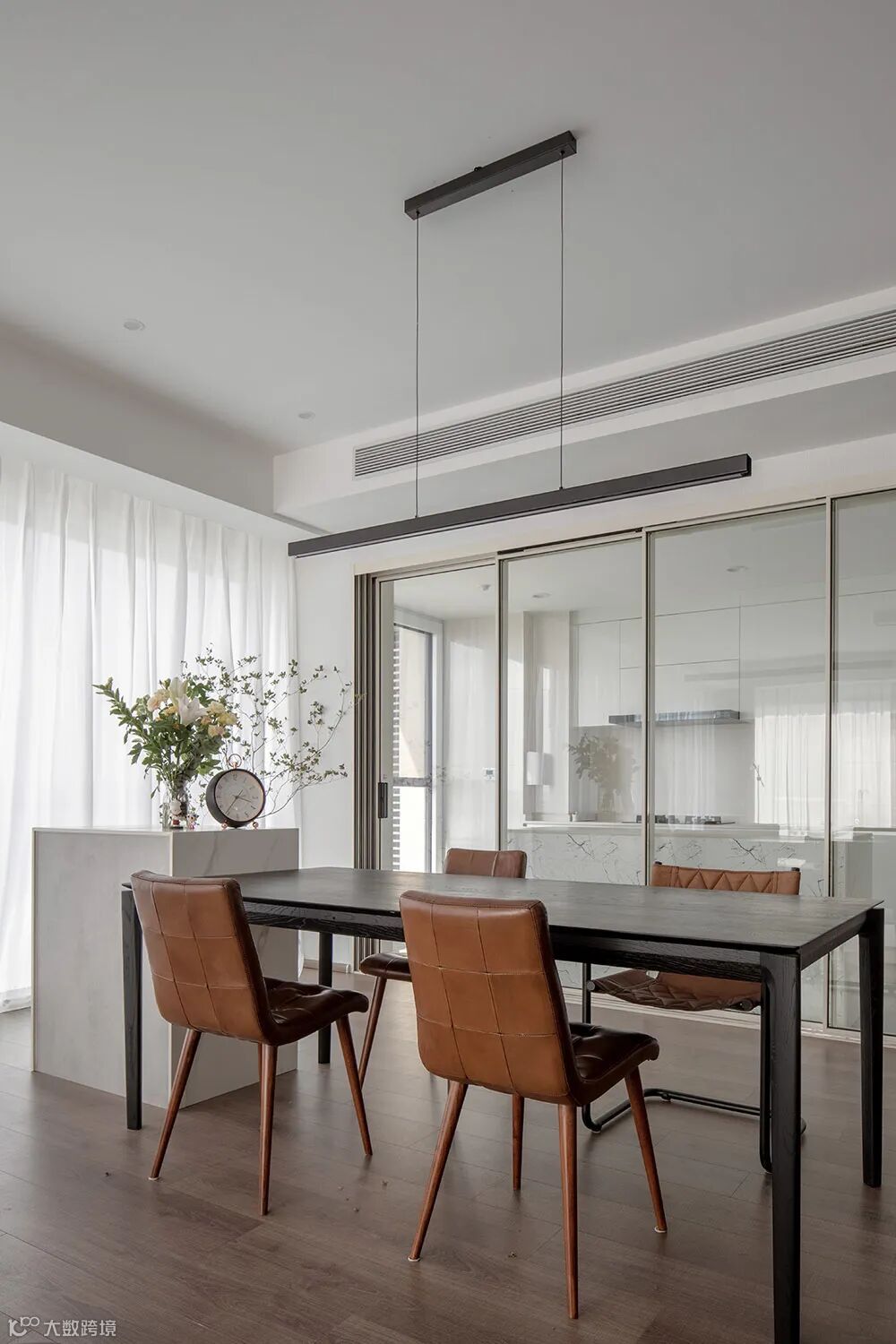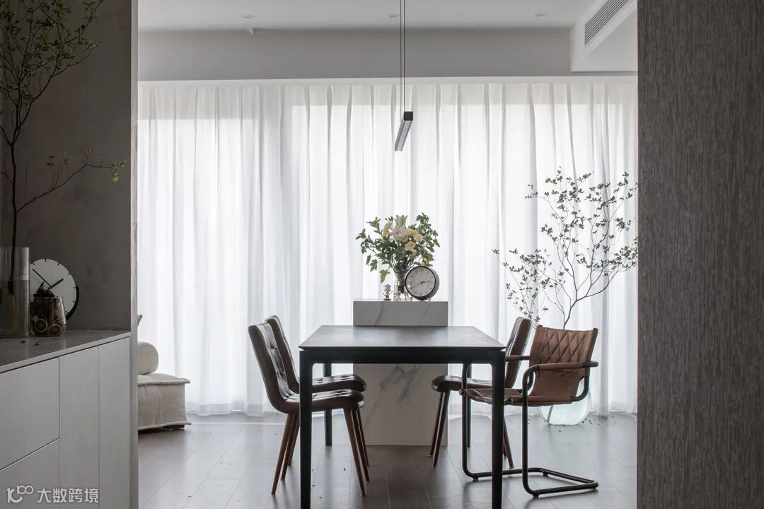 黑色木纹的餐桌与白色的岛台