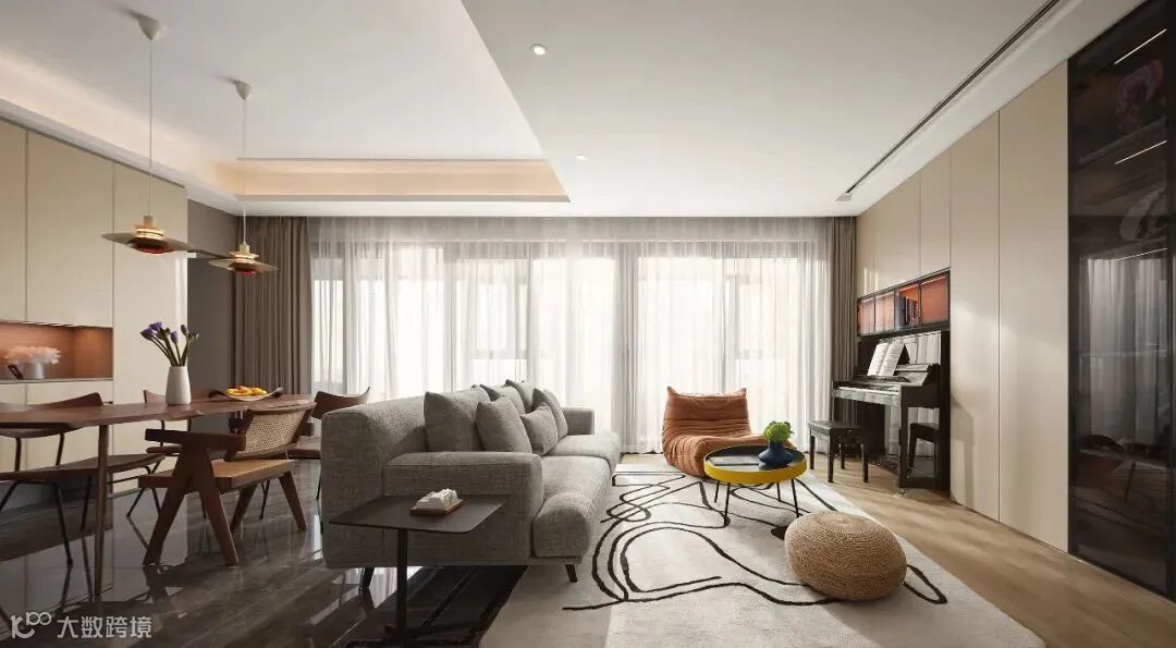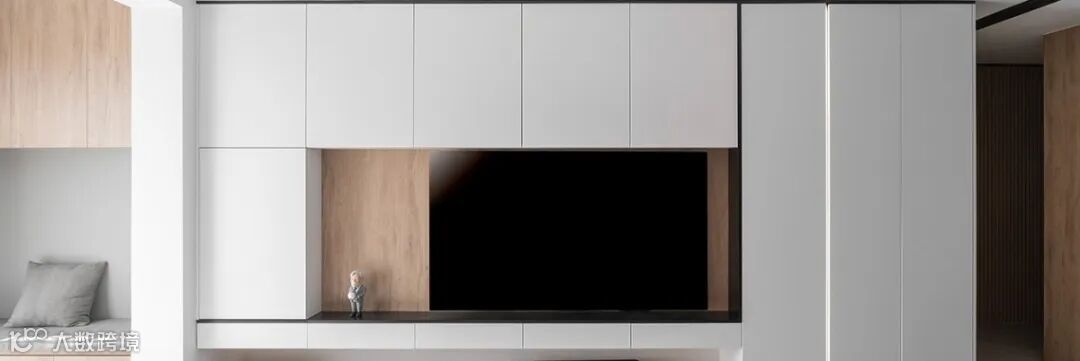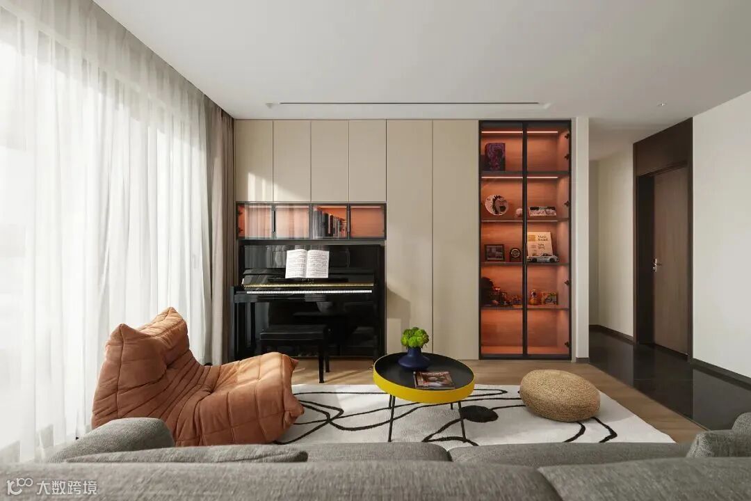 客厅,无主灯设计让空间视觉更加流畅,投影替代电视,幕布隐藏于整墙收纳柜上方。黑框玻璃展示柜削弱了柜体的厚重感,业主的收藏品陈列于内,既装点了生活,也增加了空间的观赏性。