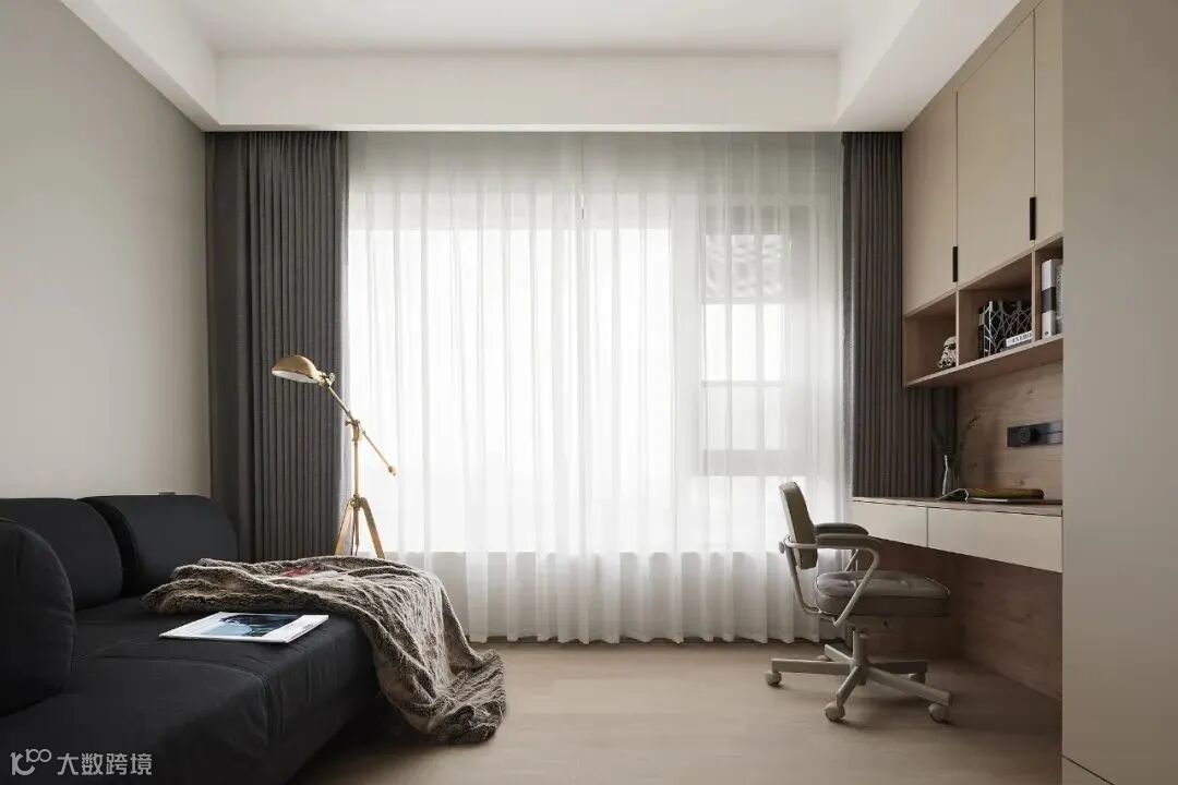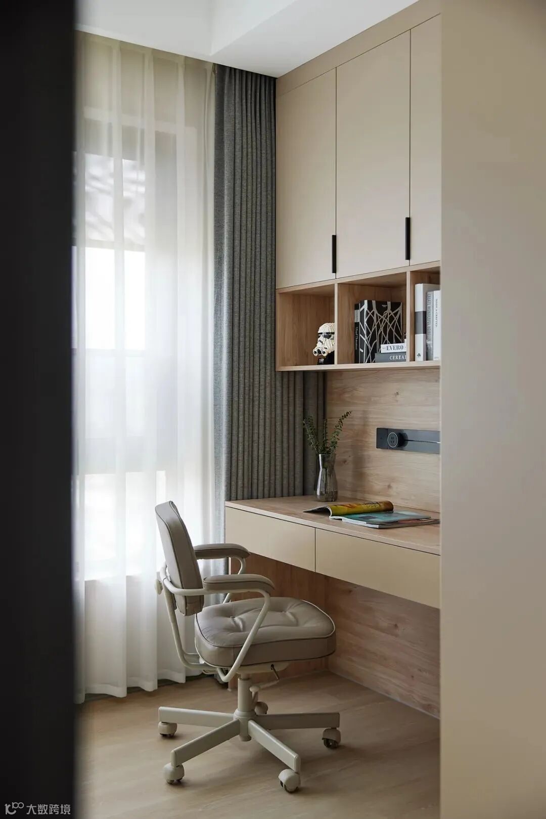 书桌收纳柜一体化,给室内预留出自由的活动空间,让空间拥有更多可变性,满足业主不同居住阶段的使用需求。