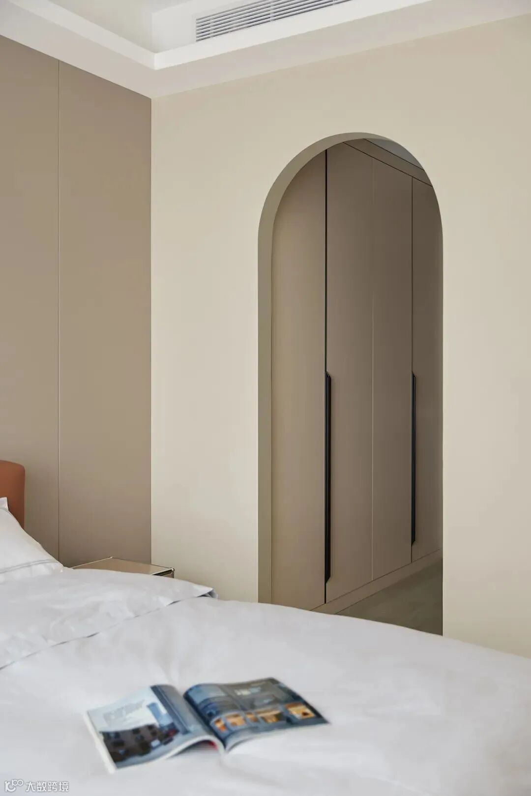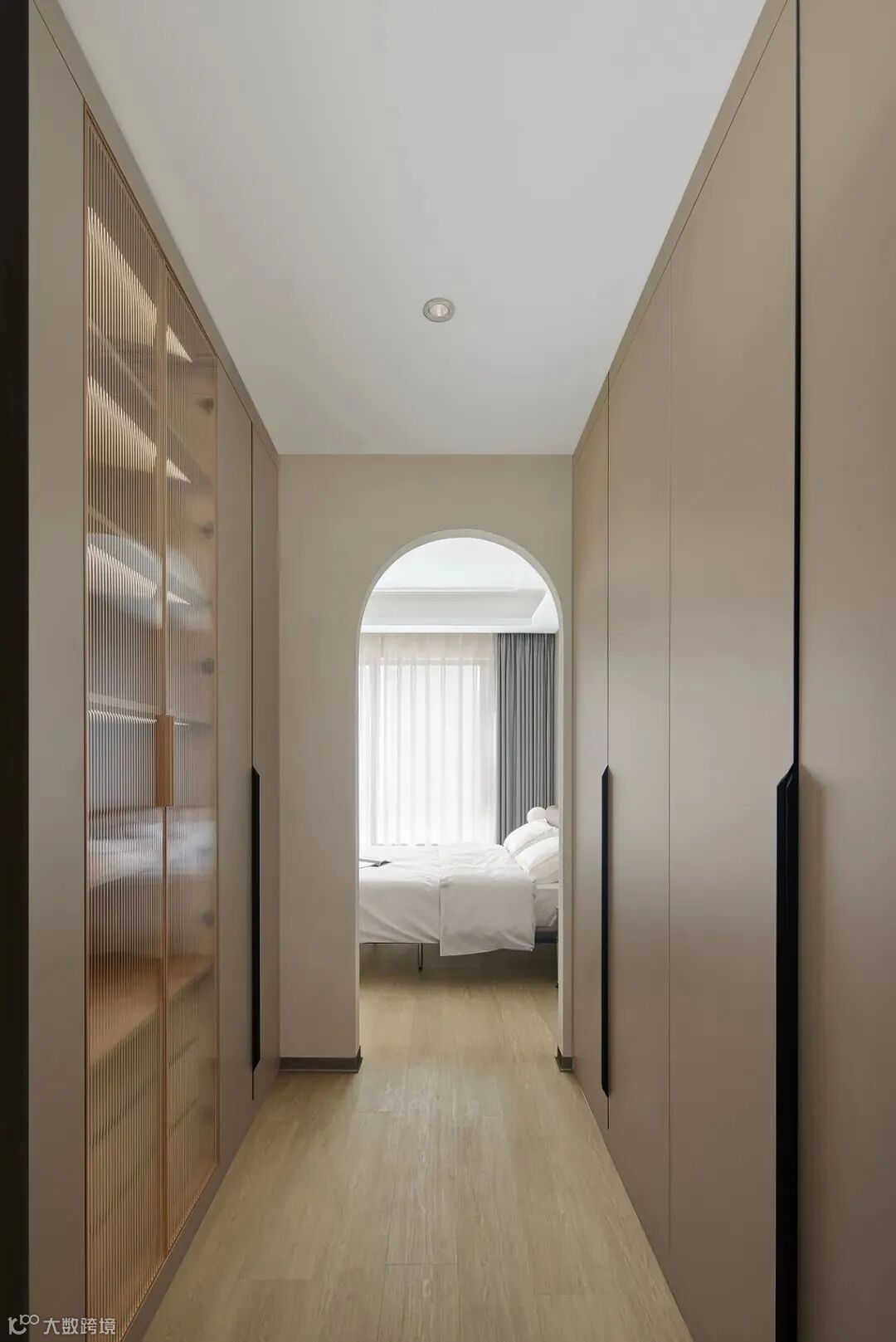 以前衣帽间是大富人家的专属,现在只要好好规划空间就能在卧室打造一个步入式衣帽间。拱形门后的步入式衣帽间营造出空间的纵深感,局部的长虹玻璃柜门,增添了空间通透性。