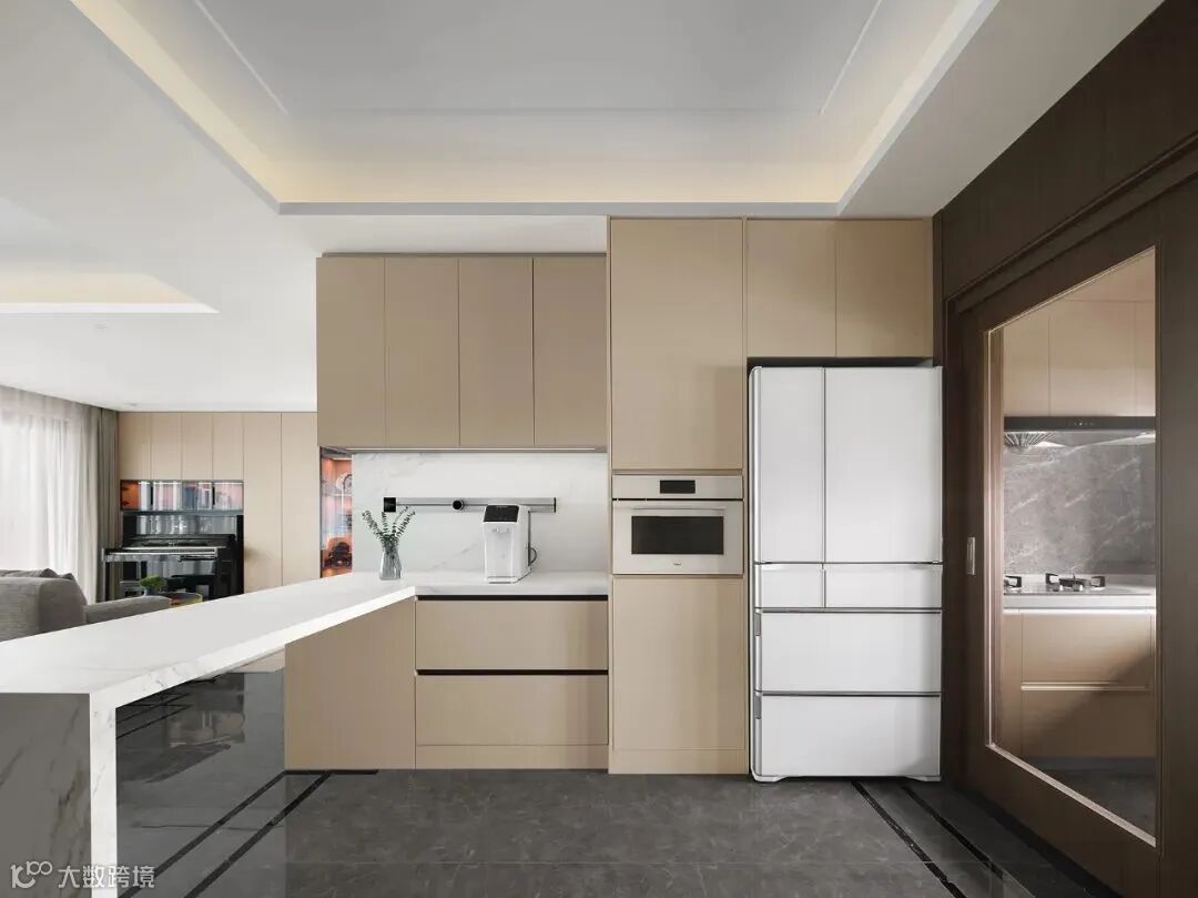 中厨和西厨紧挨在一起,用玻璃推拉门隔绝中厨油烟。西厨设计架空的岛台,既可满足日常备菜之用,还可作为吧台,一举两得。