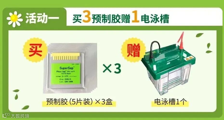 优惠详情:购买3个SuperSep™ Phos-tag™预制胶,即可免费获得电泳槽1个。