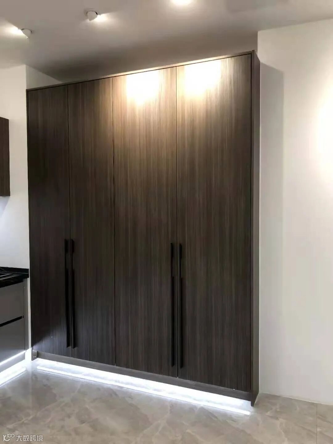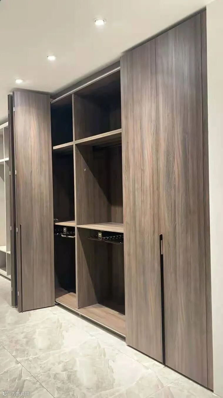 侧面是高柜,柜门大面积使用H3192 ST19棕色线条金属木纹这一花色,将其线条金属木纹展现得淋漓尽致,线条略微有些规则,带来视觉上的变化且更具层次感。