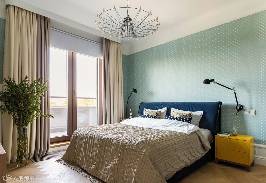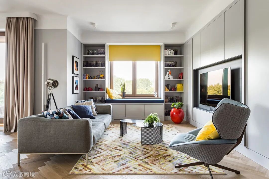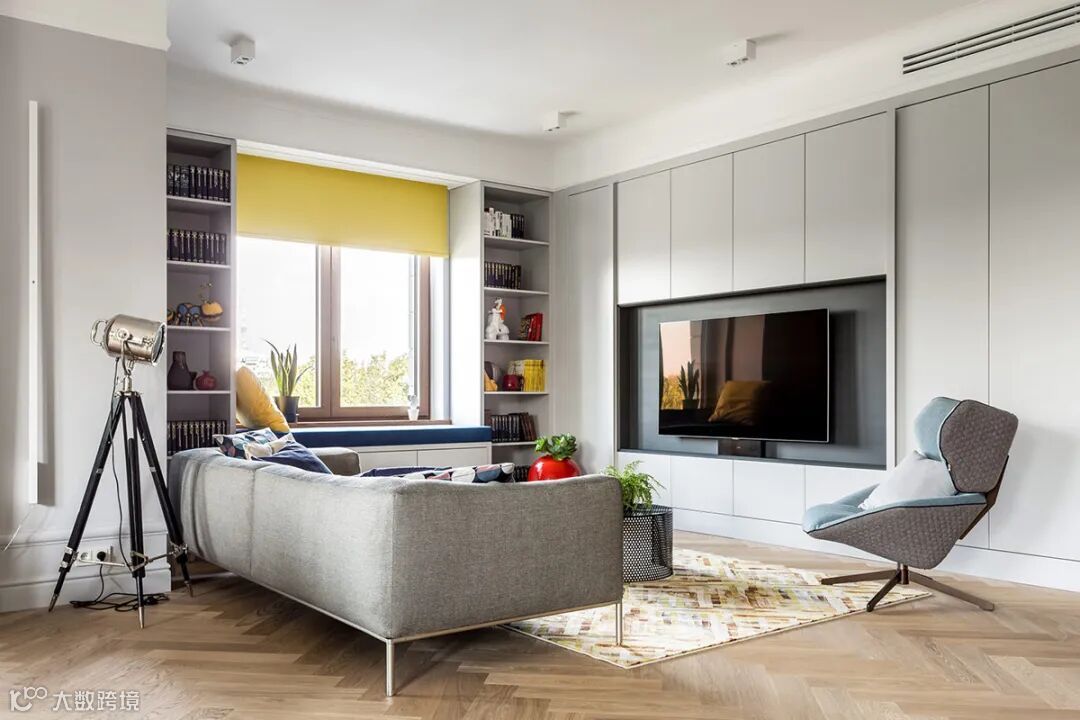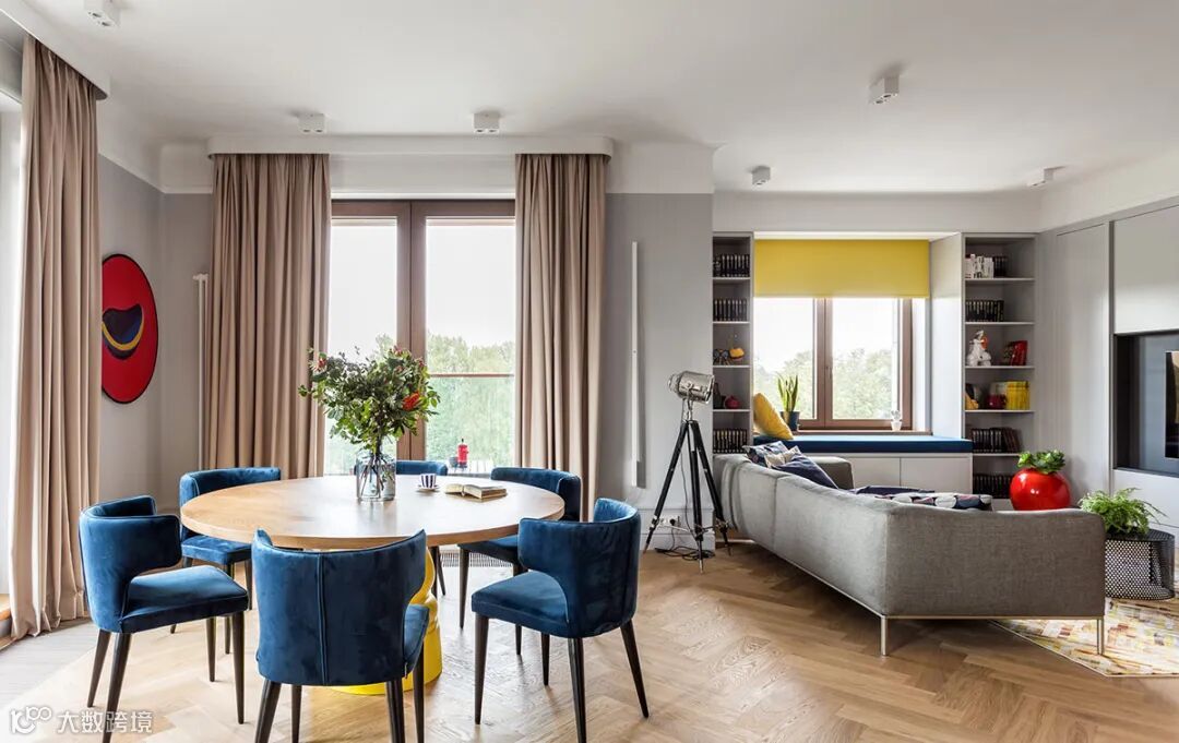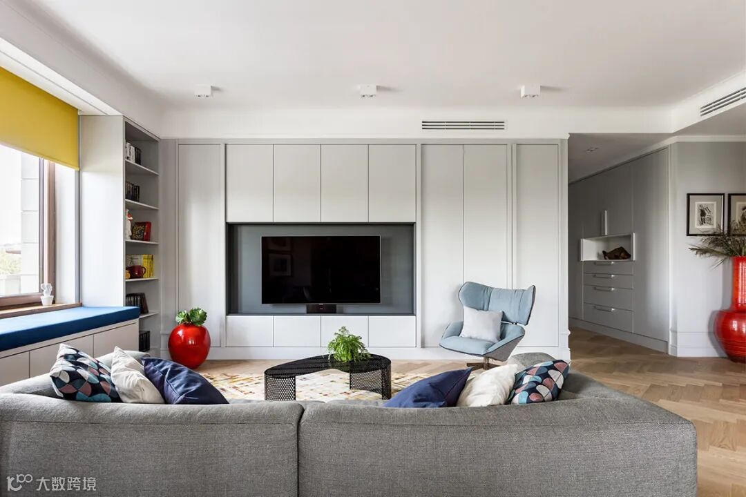 整面的媒体墙都进行了储物空间的设置,保证家中物品可以被收纳妥当,装饰画、靠垫出现的蓝色调,巧妙引入后方的餐厅区域。
