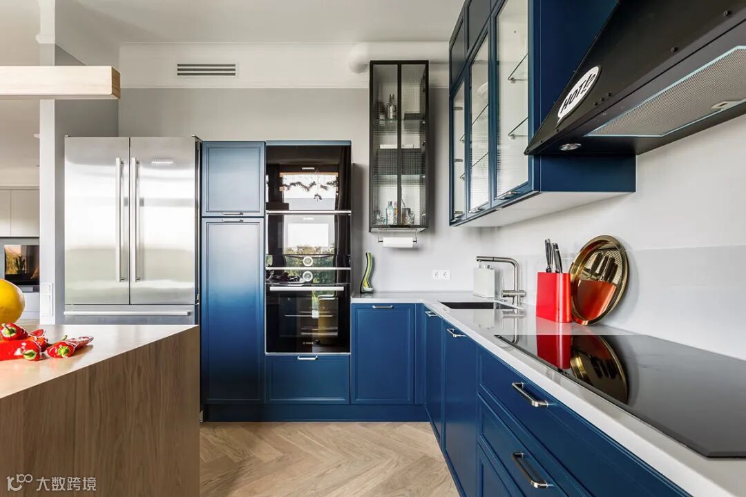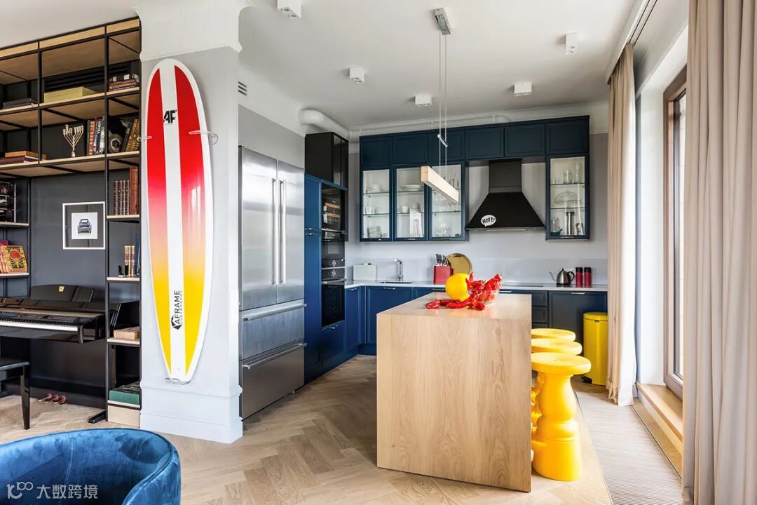 厨房区为了避免亮色空间的杂乱感,设计师十分注重功能区之间的连接。