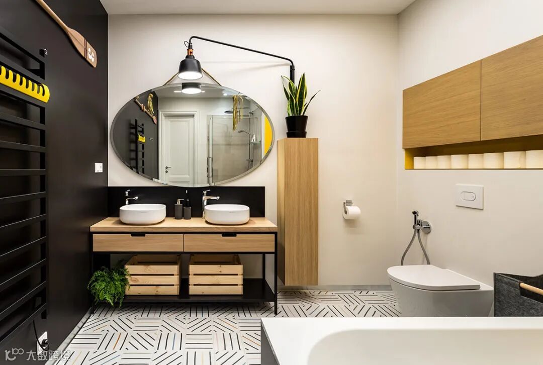空间足够宽敞,双人洗脸池、浴缸、电热毛巾架