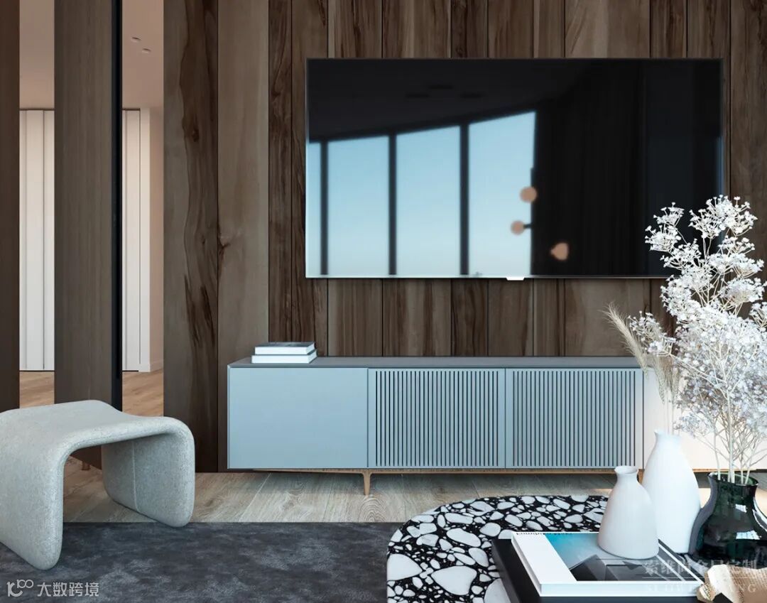客厅空间摈弃了繁复的装饰,以细节放大我们的感受与空间想象。黑白灰的基调搭配胡桃木,格调又经典。