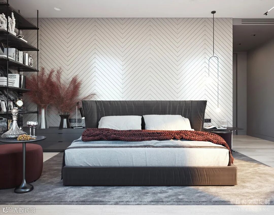 卧室黑白灰的设计形成空间层次感,整体大气而不失温暖,再加入跳跃的亮色加以点缀,将轻奢的气质最大化彰显。