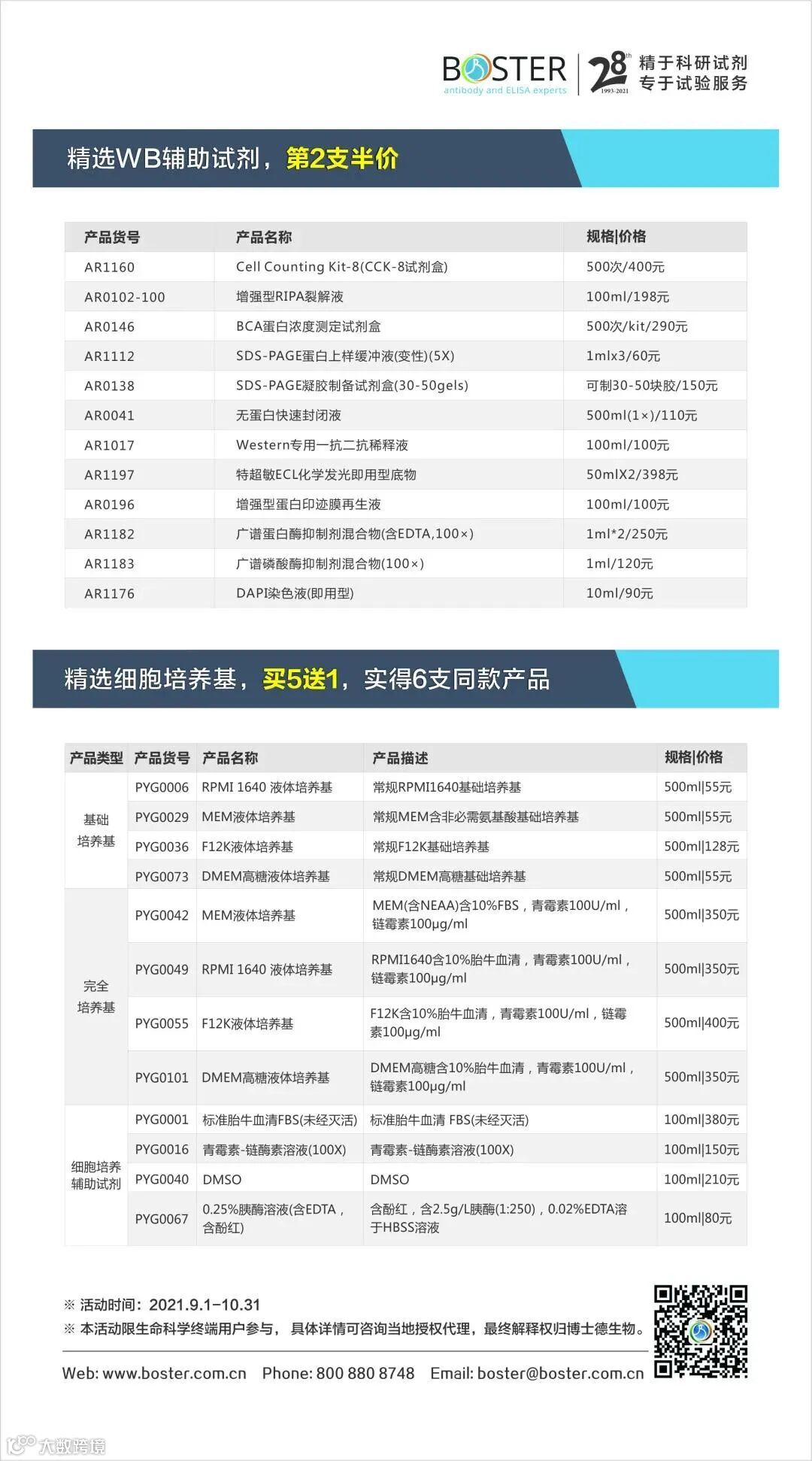 2. 订购满赠礼:购买任意ELISA或一抗产品(不限规格),即可参与以下满赠活动,限单笔订单,多买多送;