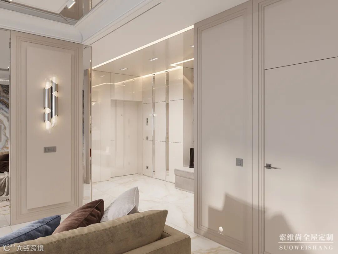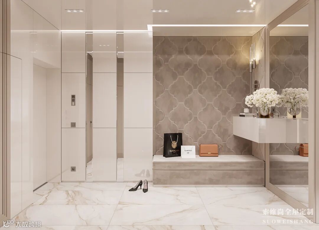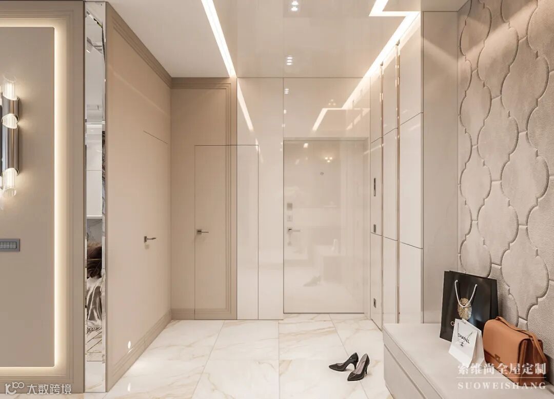 进门玄关满足房主对各种鞋子的需求,做了一个到顶的鞋柜。全身镜放在门口,出门前,整理好着装。