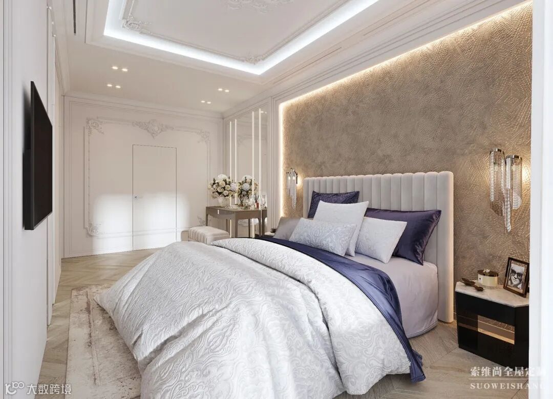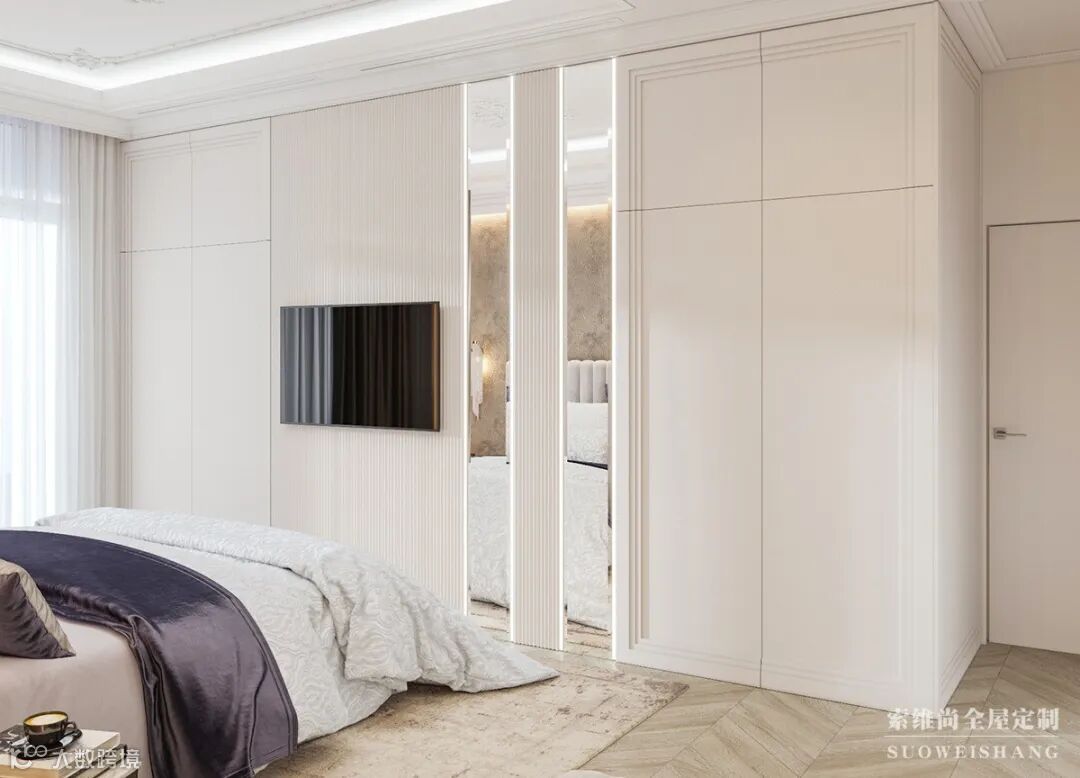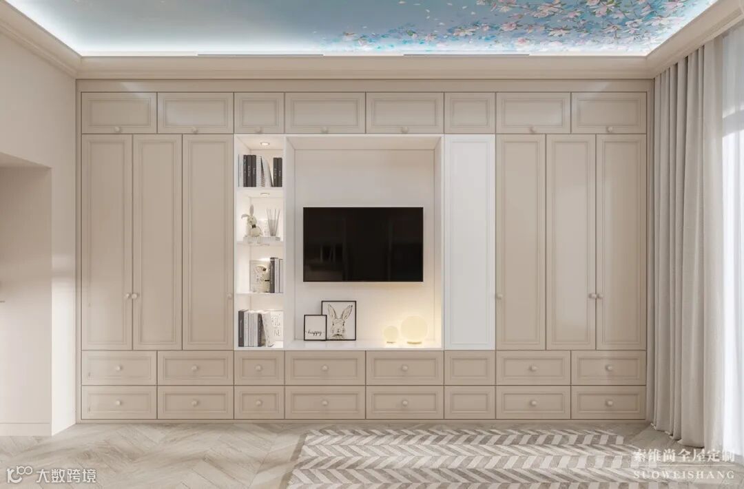 欧式风格的壁柜将整面墙充分的利用,内陷壁挂式电视的设计创意无限,充分体现了科技改变生活,创意丰富生活的理念。