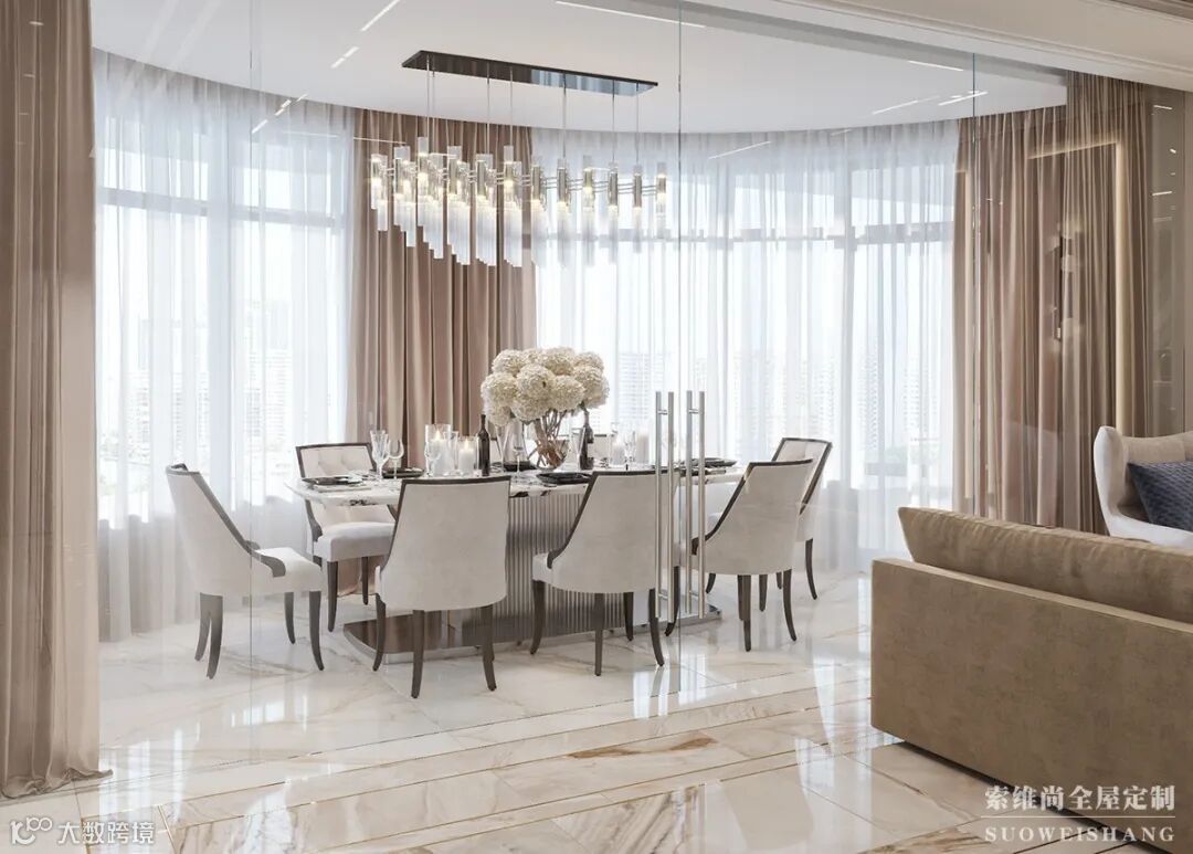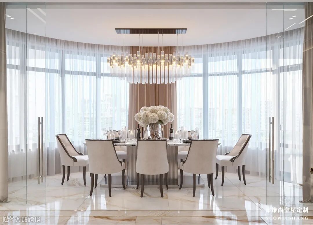 餐区精致高雅,一盏璀璨夺目的水晶光影映照在现代简约的大理石台面上,奢华皮椅搭配着镜面与不锈钢所结合的挂饰,别具一格,细枝末节处让生活更添艺术色彩。