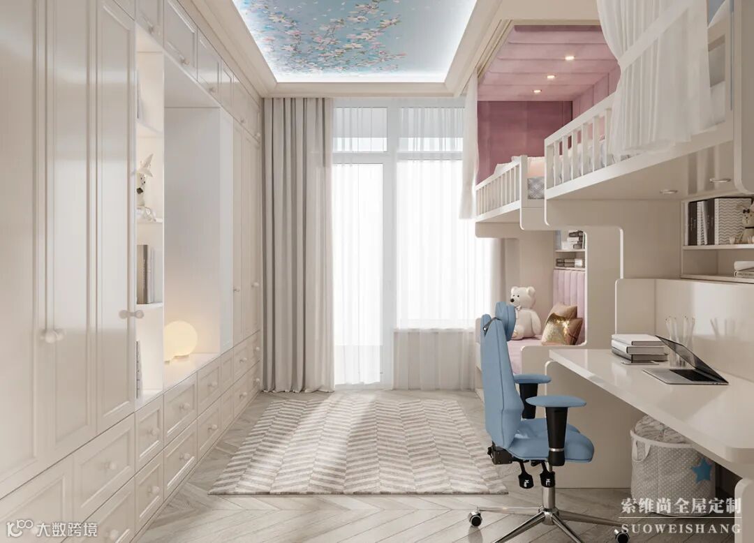 整个儿童房没有过多的颜色,暖白的基调配上木质的地板。