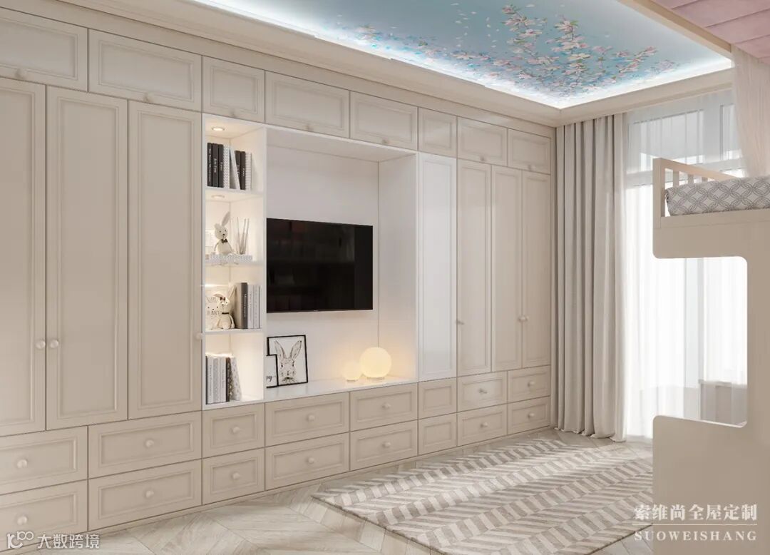 整个空间以浅色作为背景色,定制家具也与墙面几乎同色融为一体。