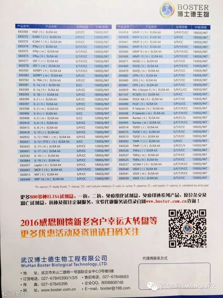更多800多种ELISA试剂盒、一抗、二抗、免疫组化试剂盒、免疫印迹系列产品、原位杂交及凋亡试剂盒、抗体及探针定制服务、实验代做服务请登录官网www.boster.com.cn查询!